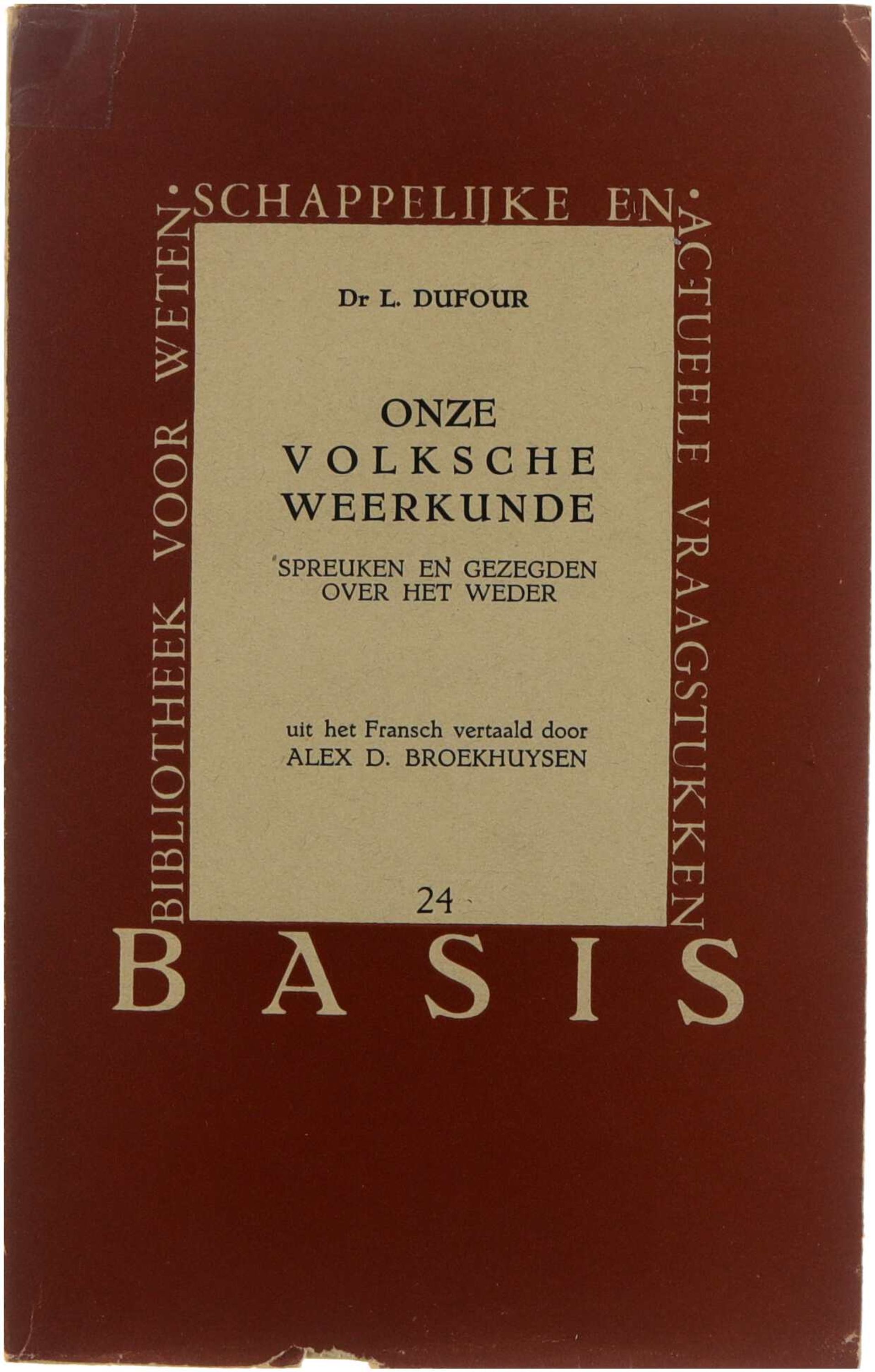 Deze uitgave bundelt honderden volkse spreuken, gezegden en weerspreuken die in Vlaanderen overgeleverd werden om het weer te voorspellen of verklaren. L. Dufour beschrijft de betekenis en oorsprong van deze weerswijsheden en onderzoekt hun relatie met landbouw, seizoenen, dieren en volksgeloof. De vertaler Alex D. Broekhuysen verzorgde een Nederlandstalige editie waarin de uitdrukkingen zijn toegelicht en gerangschikt per thema, zodat de lezer inzicht krijgt in de wisselwerking tussen volkskennis, bijgeloof en praktische weerobservatie.