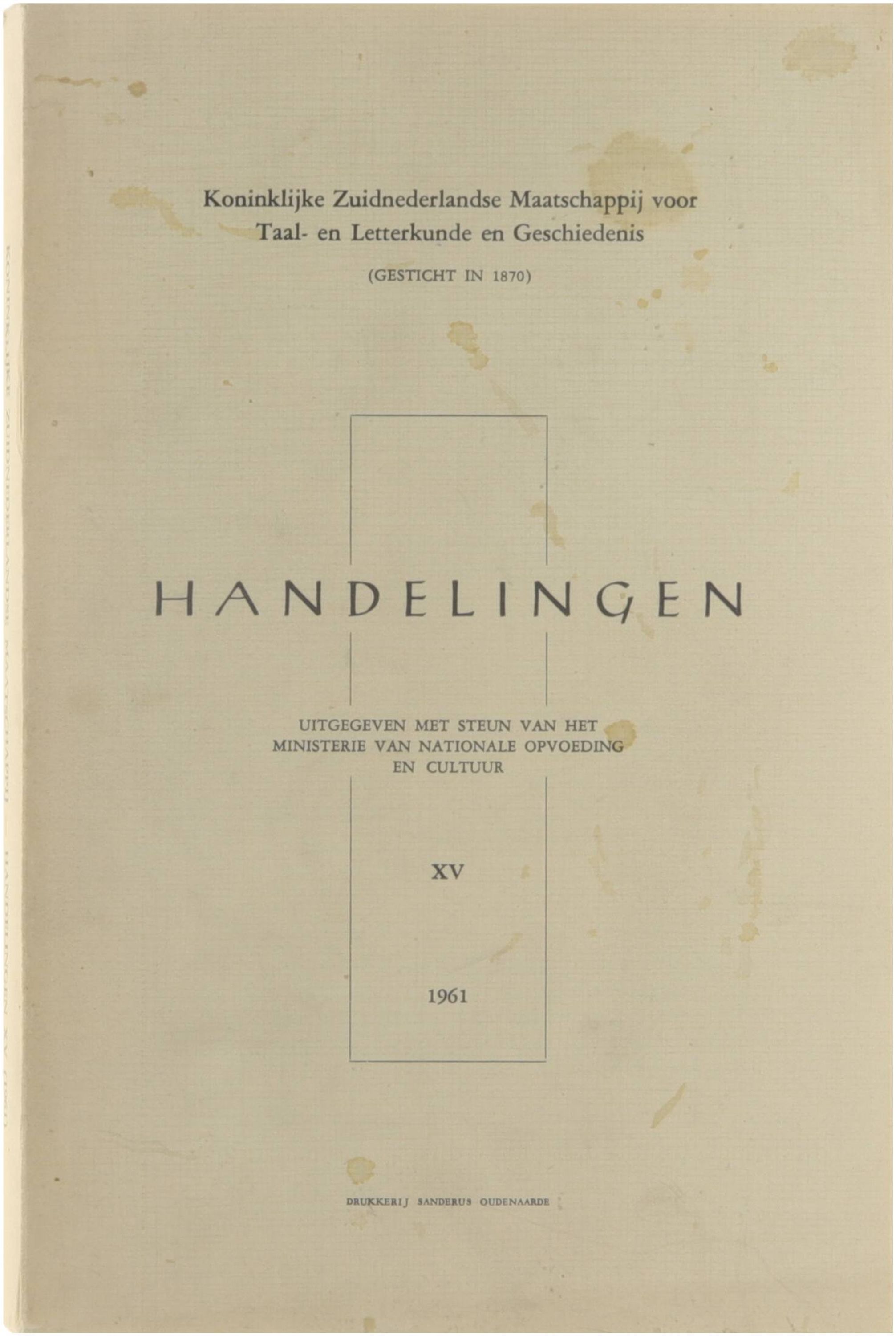 Handelingen XV 1961 met diverse bijdragen, o.a. Cyriel De Baere (Degroote), Kritische aantekeningen bij Hortulus Animae in de Nederlanden, Johannes Placotomus, Jacob de coster van Maerlant, Franse Revolutie en Bollandisten, Spiritualisatie