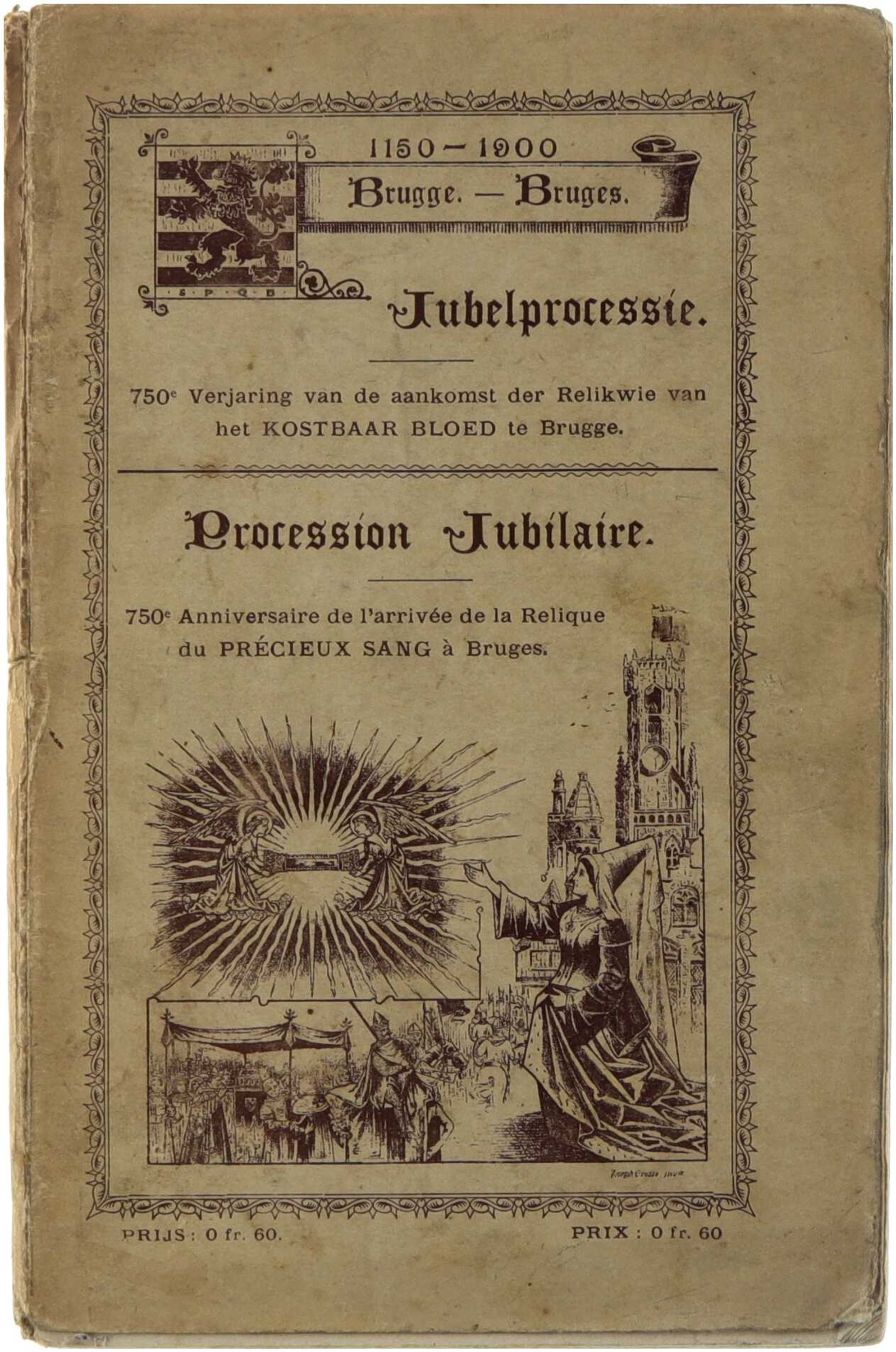 “1150-1900 Brugge-Bruges” is een tweetalige jubileumuitgave die werd gepubliceerd ter gelegenheid van de 750ste verjaardag van de aankomst van de reliek van het Heilig Bloed in Brugge. Het werk documenteert de jubelprocessie van 1900 en belicht de historische, religieuze en ceremoniële betekenis van de Heilig-Bloedverering voor de stad Brugge. Naast beschrijvingen van de processie bevat de publicatie historische toelichtingen, programmatische elementen en illustraties die de continuïteit van de traditie vanaf de middeleeuwen tot het begin van de twintigste eeuw benadrukken. Het boek vormt een waardevolle bron voor de studie van religieuze rituelen, stedelijke identiteit en volksdevotie in Brugge. Het boekje eindigt met reclames voor de handelszaken.