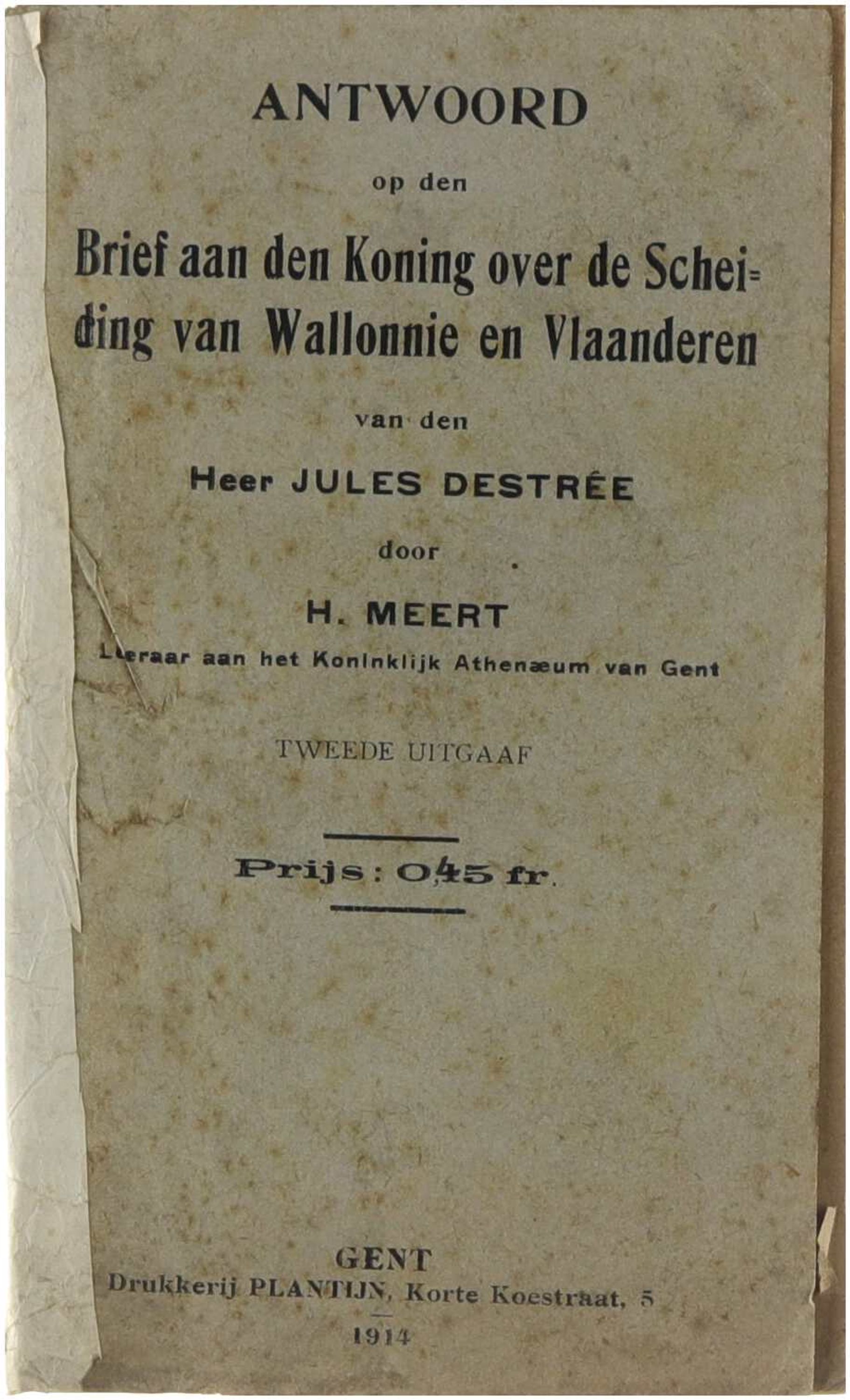 Deze brochure vormt een polemisch en politiek antwoord op de beroemde open brief van Jules Destrée aan de koning, waarin de scheiding tussen Wallonië en Vlaanderen werd bepleit. De auteur verwerpt Destrées stellingen en verdedigt de eenheid van België vanuit een Vlaamsgezind perspectief, met aandacht voor taalrechten, culturele gelijkwaardigheid en historische argumenten. Het werk weerspiegelt de scherpe communautaire spanningen aan de vooravond van de Eerste Wereldoorlog en vormt een waardevol document binnen het debat over de Belgische staatsstructuur.
