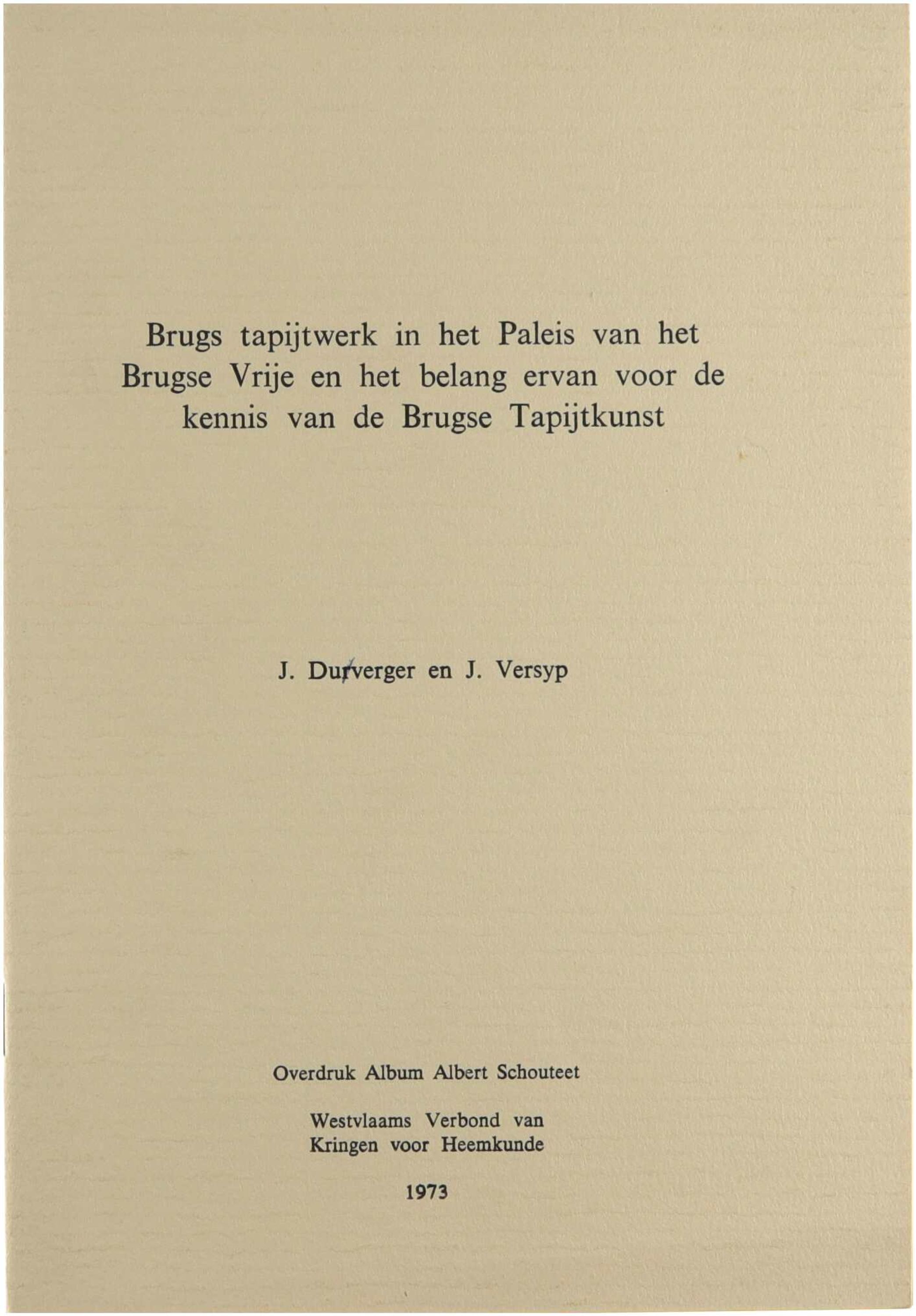 Brugs tapijtwerk in het paleis van het Brugse Vrije en het belang ervan voor de kennis van de Brugse tapijtkunst is een kunsthistorische studie waarin J. Duverger en J. Versyp het bewaarde tapijtwerk in het paleis van het Brugse Vrije analyseren. De auteurs beschrijven de herkomst, iconografie, stijl en technische kenmerken van de tapijten en situeren deze binnen de bredere ontwikkeling van de Brugse tapijtkunst. Het werk toont aan hoe dit specifieke ensemble van wandtapijten essentieel is voor het begrip van productie, patronage en artistieke kwaliteit van tapijtweefkunst in Brugge. De bijdrage verscheen oorspronkelijk in het Album Albert Schouteet en werd nadien als afzonderlijke overdruk verspreid.