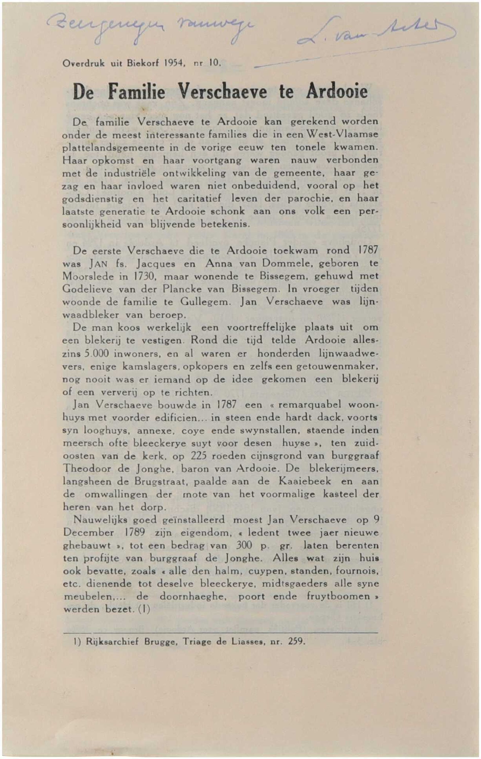“De familie Verschaeve te Ardooie” is een genealogische en heemkundige studie waarin L. Van Acker de geschiedenis van het geslacht Verschaeve in Ardooie reconstrueert. Op basis van archivalisch onderzoek worden de oorsprong, verwantschappen en maatschappelijke positie van de familie geschetst, met aandacht voor landbouwactiviteiten, eigendom en lokale inbedding. Het artikel biedt inzicht in het plattelandsleven en de sociale structuren van West-Vlaanderen en past binnen de bredere traditie van familiale en lokale geschiedschrijving. De bijdrage verscheen oorspronkelijk in het tijdschrift Biekorf en werd later als afzonderlijke overdruk verspreid. Samenvatting zelf geformuleerd op basis van algemene informatie; geen officiële bron beschikbaar.