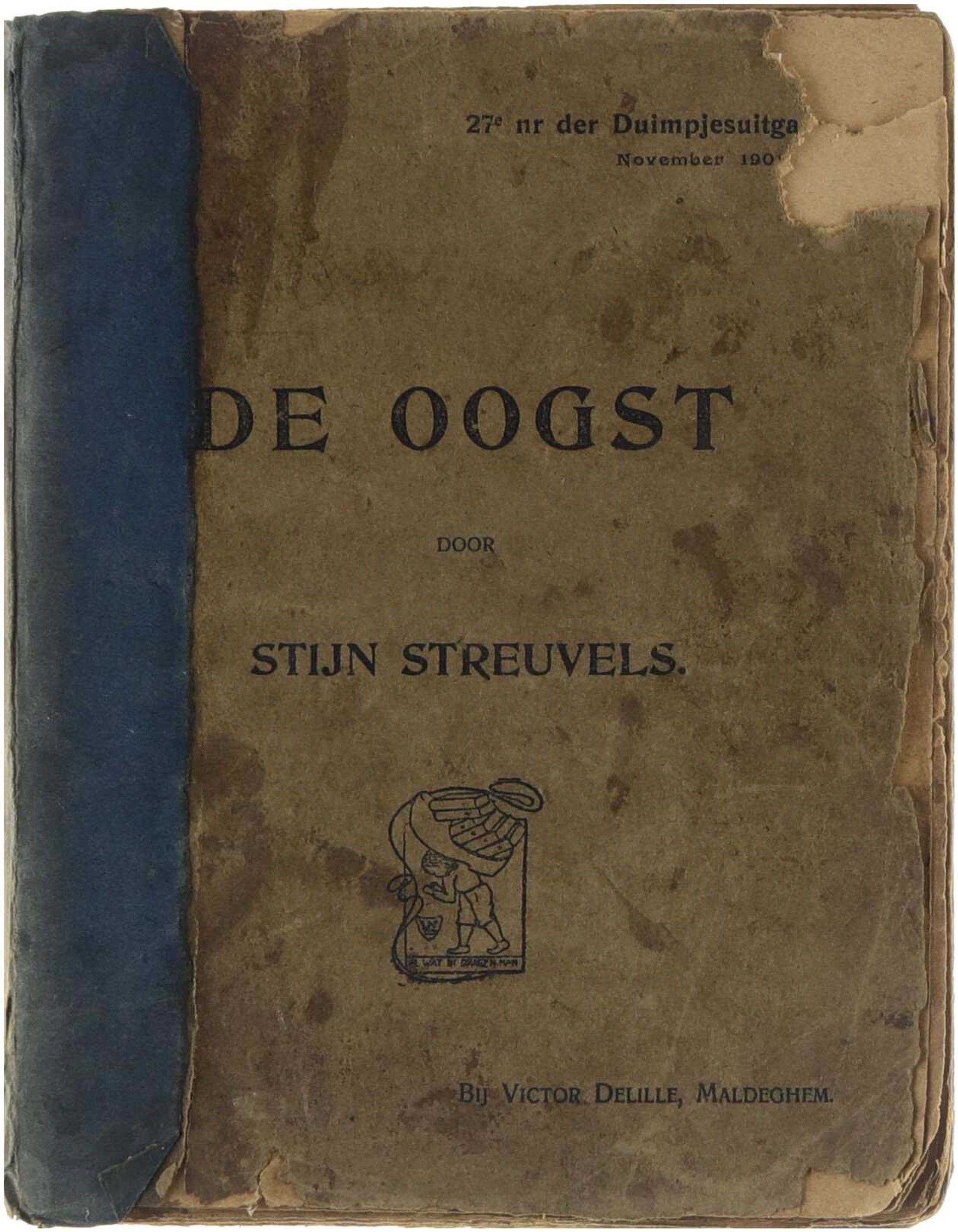 Hoekje uit voorkaft, schutblad en titelblad; rug verstevigd