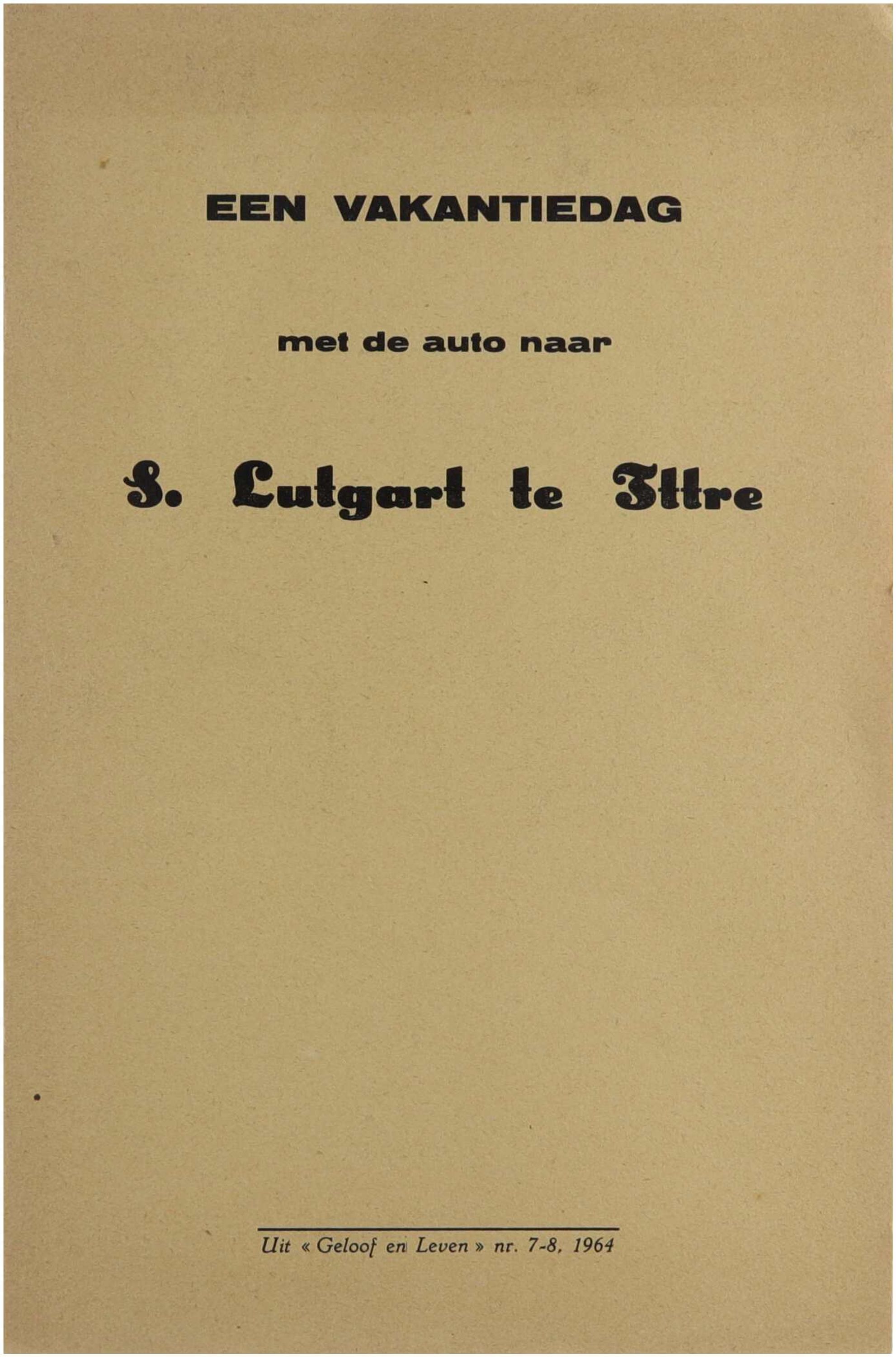Een vakantiedag met de auto naar S. Lutgart te Ittre is een religieus-inspirerende en beschrijvende bijdrage waarin A. Deboutte een daguitstap schetst naar het bedevaartsoord van Lutgardis van Tongeren te Ittre. De tekst combineert praktische reisindrukken met historische en spirituele toelichting bij de heilige en de plaats van verering. De bijdrage weerspiegelt de naoorlogse katholieke cultuur waarin religieuze bedevaarten en recreatieve uitstappen samengingen, en verscheen oorspronkelijk in het tijdschrift Geloof en leven.
