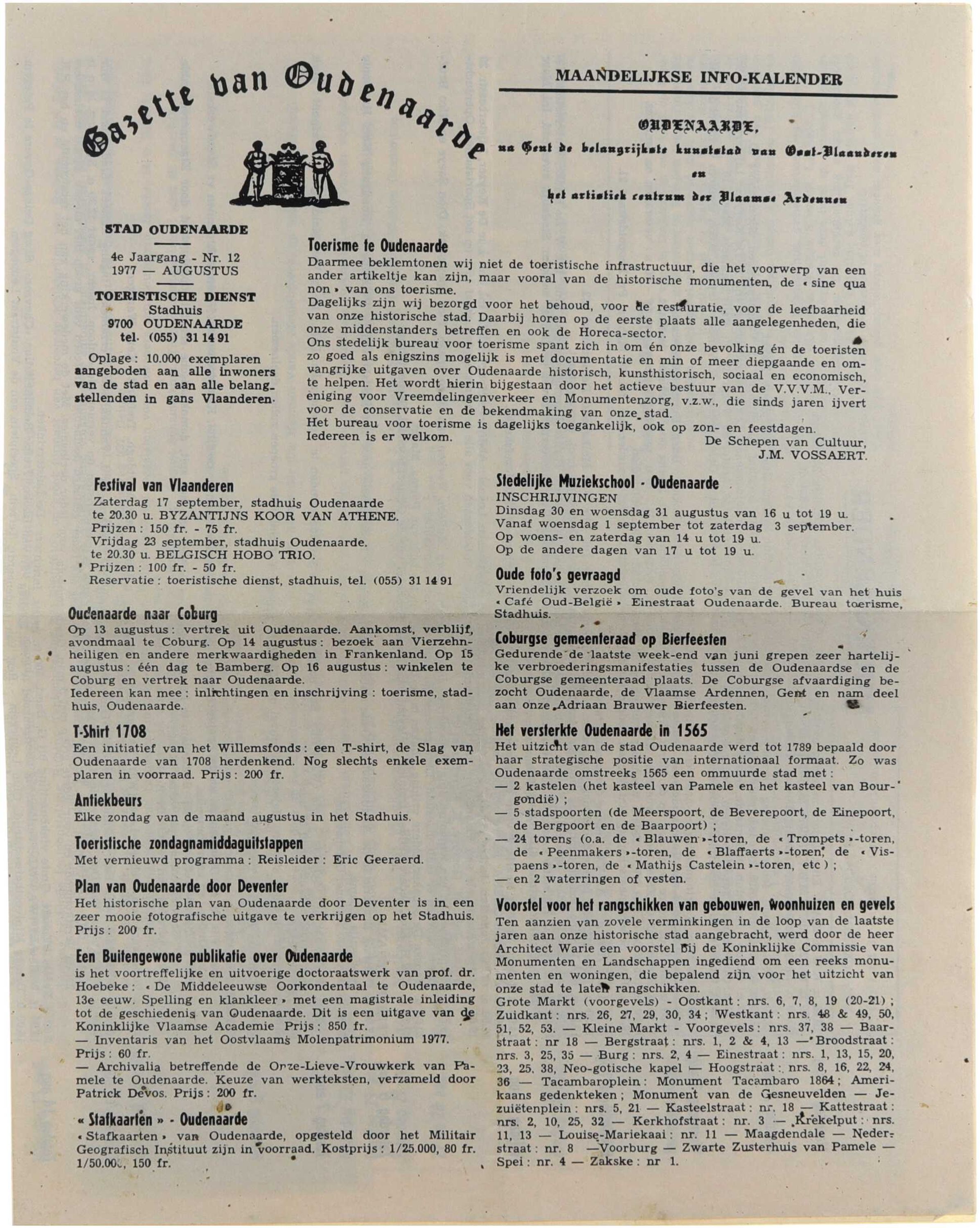 Dit is bundeling van2 nummers van de Gazette van Oudenaarde, uitgegeven door de Toeristische Dienst van Oudenaarde in 1977. De reeks bevat artikels en illustraties over het historische, culturele en toeristische erfgoed van de stad, met aandacht voor monumenten, lokale geschiedenis, evenementen en bezienswaardigheden. De uitgave had een informatief en promotioneel karakter en was bedoeld voor bezoekers en geïnteresseerden in het stedelijk patrimonium van Oudenaarde.
