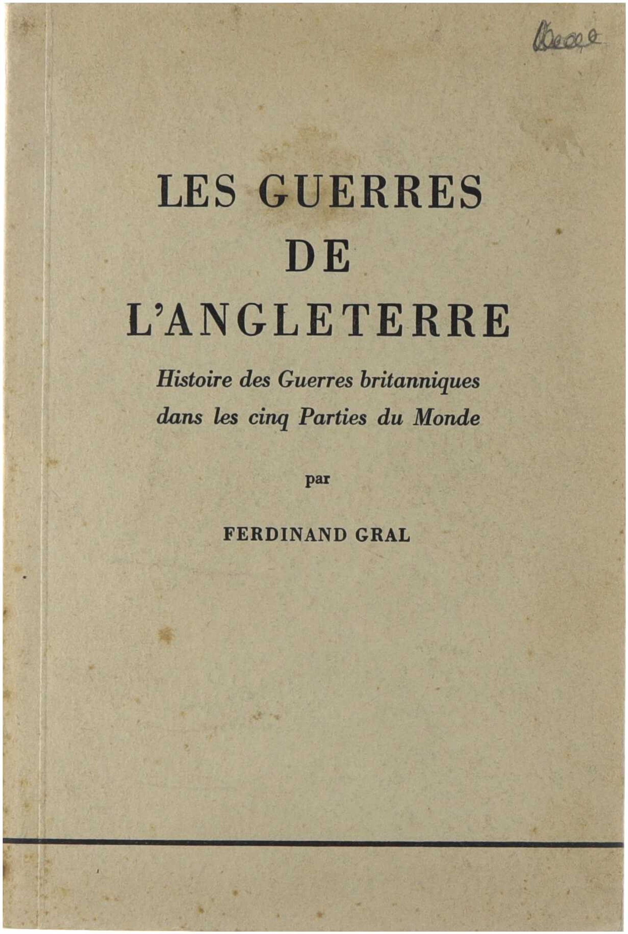 Publié en 1941, cet ouvrage de Ferdinand Gral retrace l'histoire des conflits militaires menés par l'Angleterre à travers le monde. Le livre est structuré de manière chronologique et thématique, débutant par les guerres internes et les conflits médiévaux avec la France (Guerres de Cent ans), puis passant à l'expansion coloniale et maritime britannique contre des puissances telles que l'Espagne et la Hollande. Il couvre également les guerres de coalition, la conquête de l'Inde et de l'Afrique, pour finir sur le conflit contemporain à sa publication : la guerre contre le Reich allemand. Le texte semble analyser l'évolution de la puissance impériale britannique à travers son hégémonie militaire séculaire. I. Les guerres intérieures de l'Angleterre . Le première guerre de Cent ans contre la France La deuxième guerre de Cent ans contre la France La lutte finale contre la France . Contre l'Irlande . La soumission du Pays de Galles et de l'Ecosse II. La période des guerres européennes et des guerres d'outre-mer . La première grande attaque contre l'Espagne . La Hollande « knocked out » . L'écroulement de l'empire mondial de l'Espagne Anéantissement de la puissance commerciale mondiale de la Hollande . La troisième guerre de Cent ans contre la France La lutte contre l'encerclement franco-espagnol . La conquête de l'Inde . La guerre de l'opium . Bilan indien . Prise de possession des mers du Sud . III. Les guerres de coalition de l'Angleterre contre la France . IV. La conquête de l'Afrique . V. Les guerres de l'Angleterre contre le Reich . Les guerres anglaises au cours des siècles .