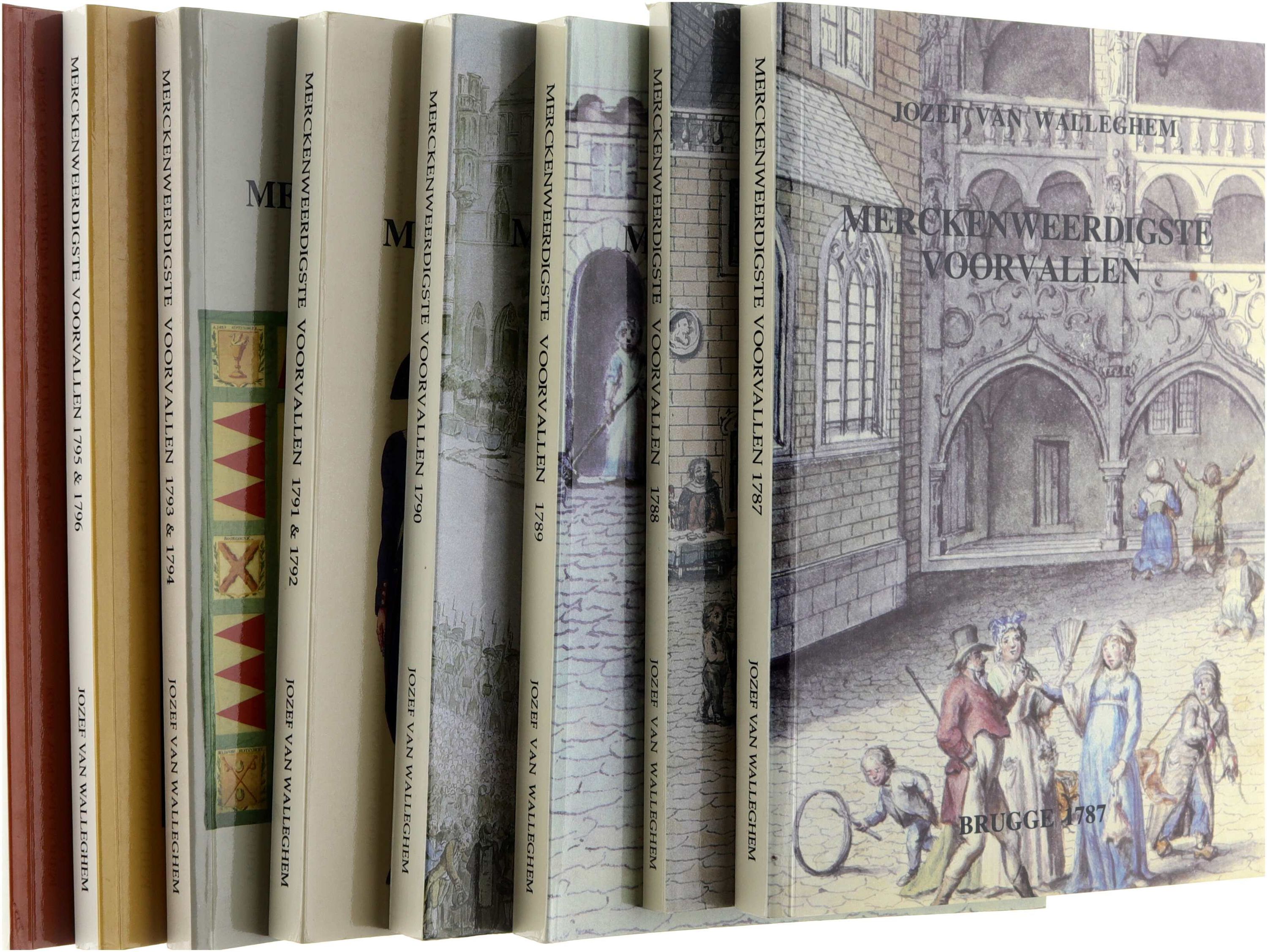 Anastatische herdruk. Deze achtdelige uitgave bevat de kritische editie van de kroniek Merckenweerdigste voorvallen van Jozef Van Walleghem, waarin de auteur de politieke, maatschappelijke en religieuze gebeurtenissen in Brugge en de Zuidelijke Nederlanden tussen 1787 en 1797 nauwgezet beschrijft. De kroniek vormt een uitzonderlijke egodocumentaire bron voor de periode van de Brabantse Omwenteling, de Oostenrijkse restauratie en de Franse tijd, en biedt gedetailleerd inzicht in het dagelijkse leven, de publieke opinie en de impact van revolutionaire veranderingen op lokaal niveau.