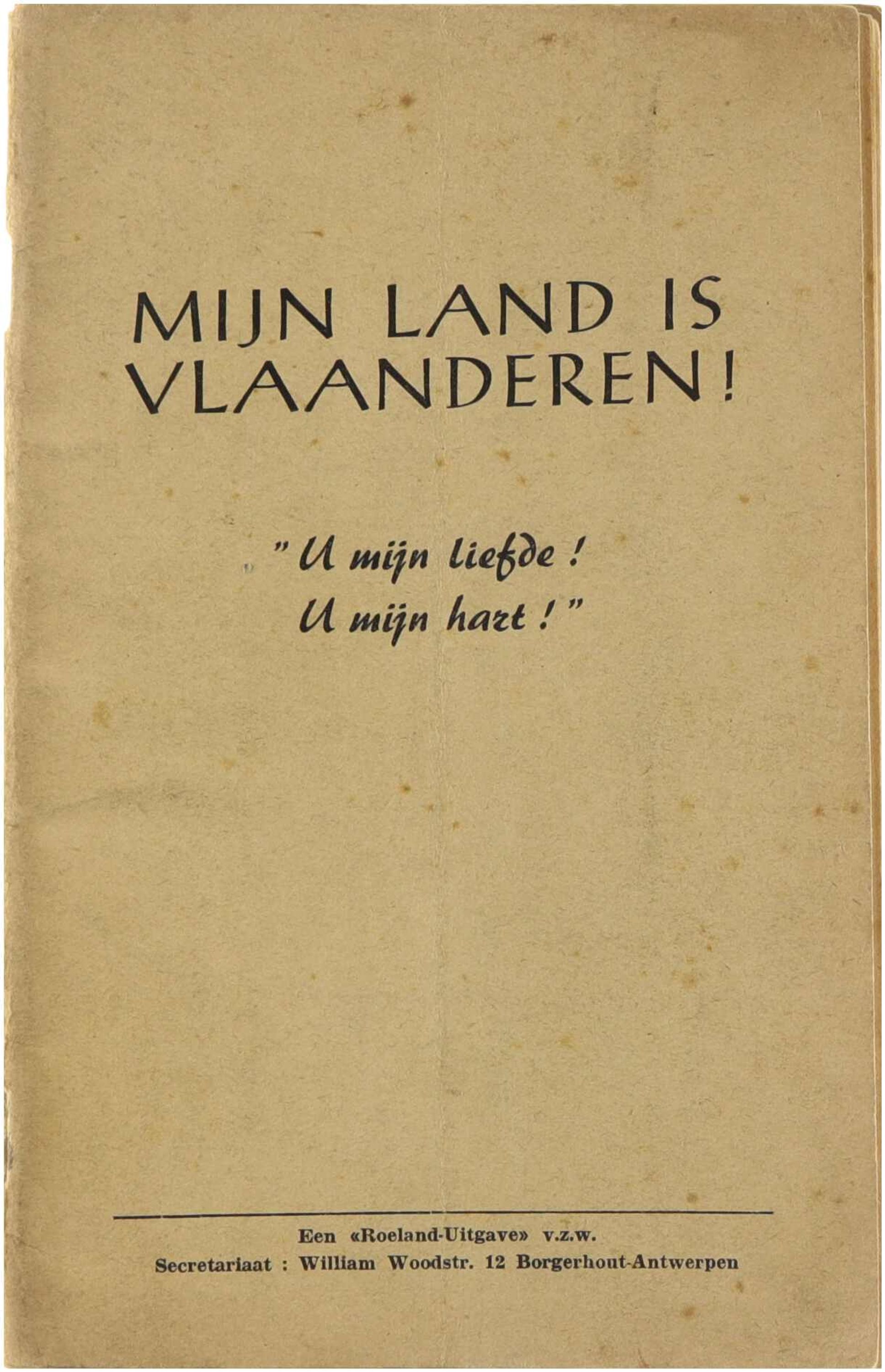 “Mijn land is Vlaanderen – U mijn liefde, U mijn hart!” is een klein, gebonden liederenboek uit midden twintigste eeuw dat onder de vlag van Roeland‑Uitgave in Antwerpen/Borgerhout verscheen en een verzameling van klassieke en traditionele Vlaamse volksliederen en zangteksten presenteert met bijbehorende aanwijzingen voor uitvoering, variërend van patriottische liederen over de schoonheid van het Vlaamse landschap tot eenvoudige wiegeliedjes en dorpsliederen die destijds vaak werden gebruikt in zanggroepen, scholen en culturele verenigingen om gemeenschapszin en liefde voor Vlaanderen te bevorderen, met nadruk op melodie, tekst en uitvoeringspraktijk in het Nederlands.