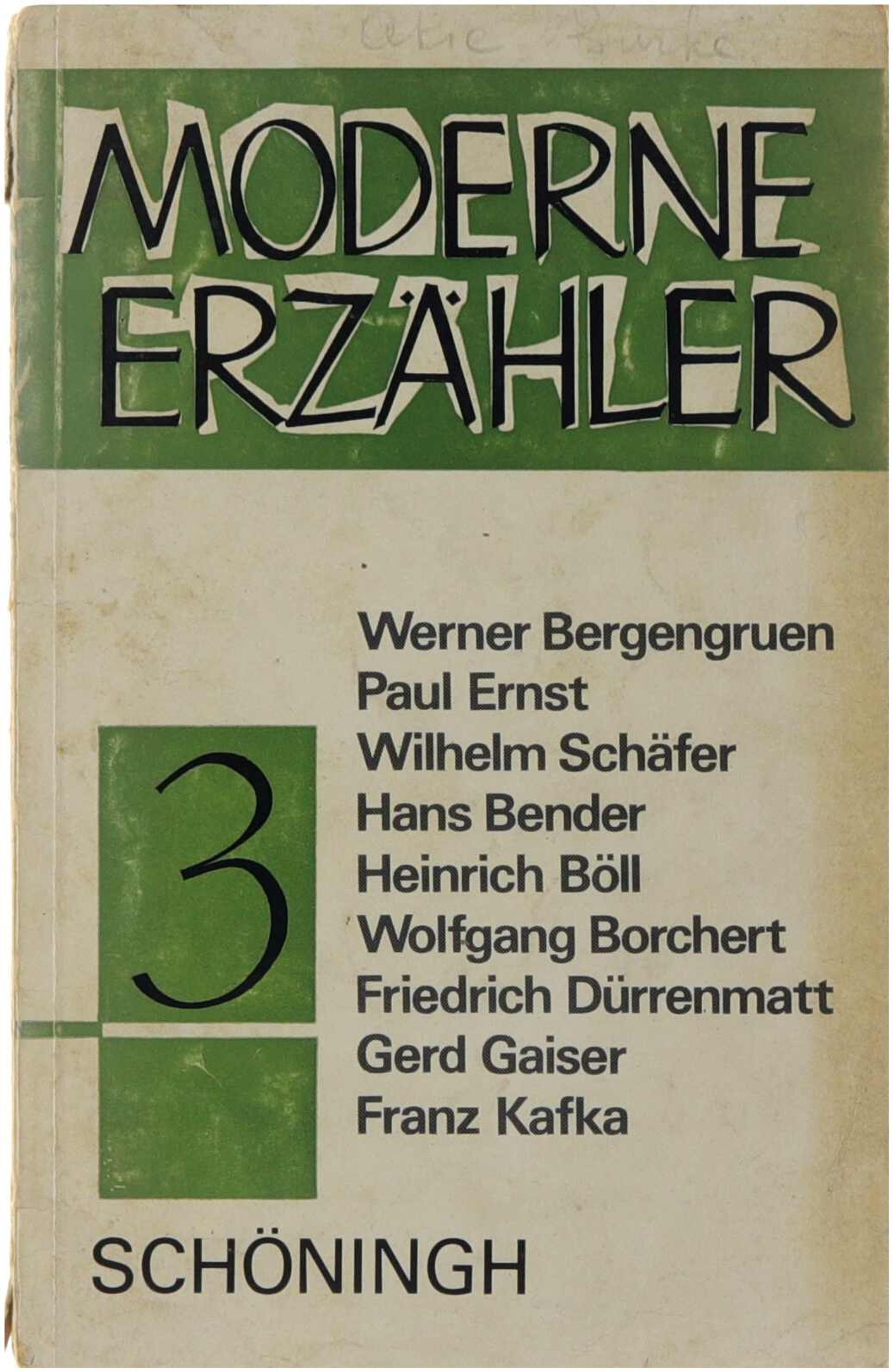 „Moderne Erzähler 3“ ist ein in deutscher Sprache erschienener Band der gleichnamigen Reihe beim Verlag Ferdinand Schöningh, Paderborn, der gezielt charakteristische Prosa deutsch‑sprachiger Erzähler des 20. Jahrhunderts versammelt und jeweils mit einführenden Bemerkungen zur literarischen Einordnung versieht; der Band enthält Erzähltexte oder Textauszüge und kontextualisierende Hinweise zu Autoren wie Hans Bender, Werner Bergengruen, Heinrich Böll, Wolfgang Borchert, Friedrich Dürrenmatt, Paul Ernst, Gerd Gaiser, Franz Kafka und Wilhelm Schäfer, deren Stil, Motivik und Themen exemplarisch für verschiedene Strömungen der Moderne stehen und damit literaturhistorische Entwicklungen von traditioneller Erzählkunst über existenzielle Fragestellungen bis hin zu sprachlichen Experimenten aufzeigen. Der Band richtet sich vor allem an Studierende und Lehrende der deutschen Literatur und dient als kompakte Einführung in zentrale Erzählerpersönlichkeiten und deren Werke im historischen und kulturellen Zusammenhang der Moderne.