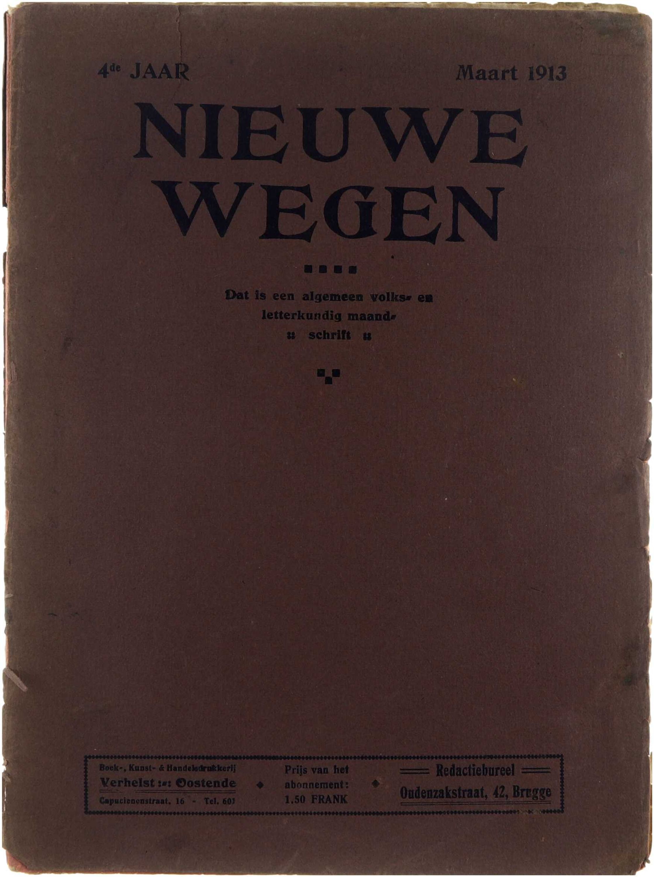 Nieuwe Wegen. Letterkundig maandschrift voor ons volk” is een Nederlandstalig literair tijdschrift. Het tijdschrift bevatte literaire bijdragen en bespiegelingen voor een breed publiek, uitgegeven door A. Gallet in Roeselare. Het fungeert als document van de literaire en culturele context van de Vlamingen in het begin van de 20e eeuw, met diverse auteurs en bijdragen verspreid over het jaar. 10,00 10151716 1 Nieuwe wegen (Vierde jaargang -5) Nieuwe wegen. Dat is een algemeen volks- en letterkundig maandschrift (Vierde jaargang nummer 5 Warden Oom; Edward Vermeulen; J. Impe; Jozef Simons; André Van Acker; Arie Sanden; Paul Van Biervliet; Nap. Flameygh; Albert Maene Verhelst (Oostende) 1913 1 0 16 ts nl g 4 Kaft gedeeltelijk losgekomen tijdschrift; literatuur; Vlaams; 1912; cultuur; maandschrift; Roeselare; Gallet Nieuwe Wegen. Letterkundig maandschrift voor ons volk” is een Nederlandstalig literair tijdschrift. Het tijdschrift bevatte literaire bijdragen en bespiegelingen voor een breed publiek, uitgegeven door A. Gallet in Roeselare. Het fungeert als document van de literaire en culturele context van de Vlamingen in het begin van de 20e eeuw, met diverse auteurs en bijdragen verspreid over het jaar.