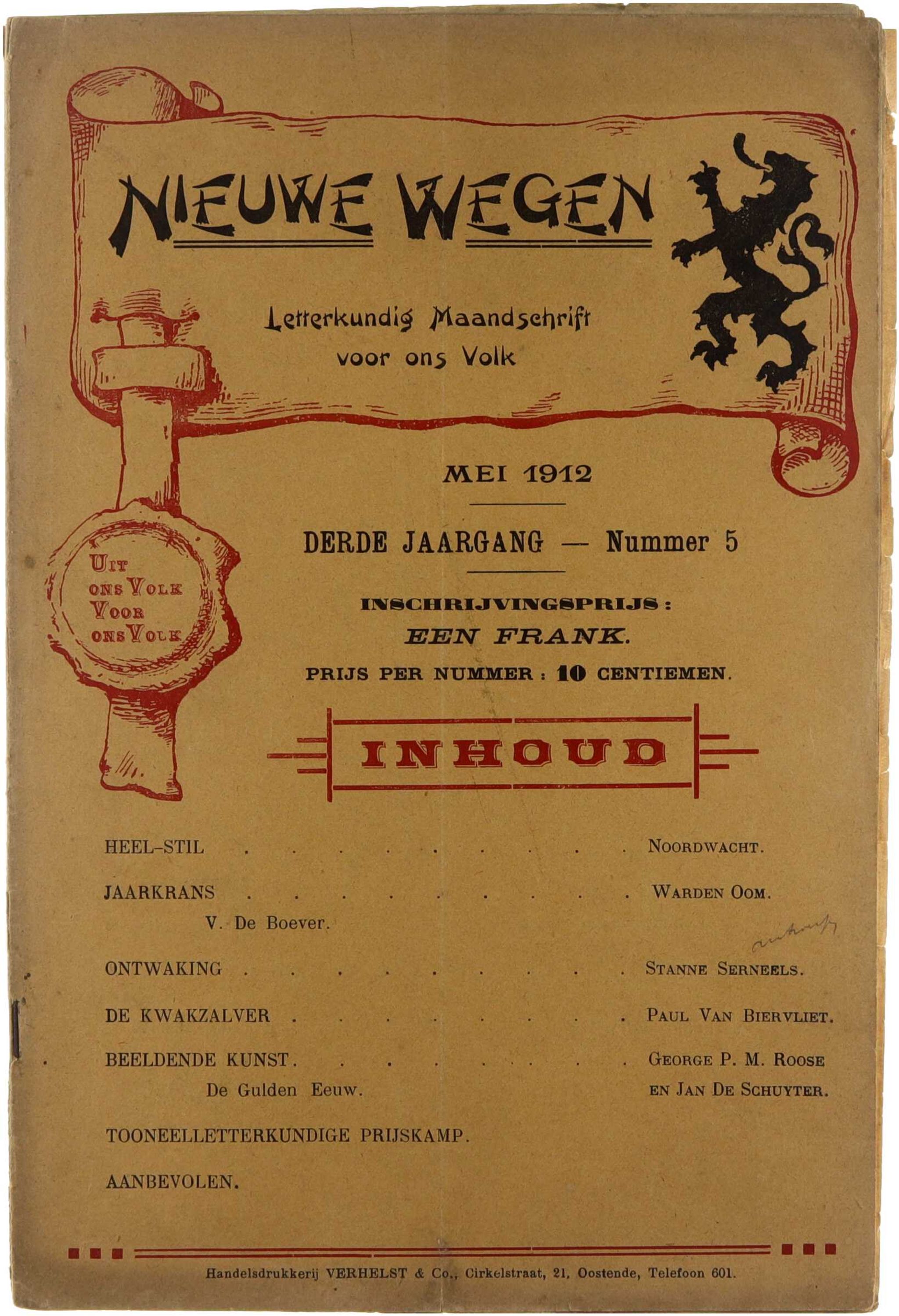 Nieuwe Wegen. Letterkundig maandschrift voor ons volk” is een Nederlandstalig literair tijdschrift. Het tijdschrift bevatte literaire bijdragen en bespiegelingen voor een breed publiek, uitgegeven door A. Gallet in Roeselare. Het fungeert als document van de literaire en culturele context van de Vlamingen in het begin van de 20e eeuw, met diverse auteurs en bijdragen verspreid over het jaar. 10,00 10151710 1 Nieuwe wegen (Derde jaargang - 6) Nieuwe wegen. Letterkundig maandschrift voor ons volk (Derde jaargang nummer 6) Warden Oom; Joseph Verhelst; Paul Van Biervliet; Hein Vandergracht; Edward Vermeulen; Stanne Serneels Verhelst (Oostende) 1912 1 0 12 ts nl m 4 Is ooit in twee gevouwen geweest. tijdschrift; literatuur; Vlaams; 1912; cultuur; maandschrift; Roeselare; Gallet Nieuwe Wegen. Letterkundig maandschrift voor ons volk” is een Nederlandstalig literair tijdschrift. Het tijdschrift bevatte literaire bijdragen en bespiegelingen voor een breed publiek, uitgegeven door A. Gallet in Roeselare. Het fungeert als document van de literaire en culturele context van de Vlamingen in het begin van de 20e eeuw, met diverse auteurs en bijdragen verspreid over het jaar.
