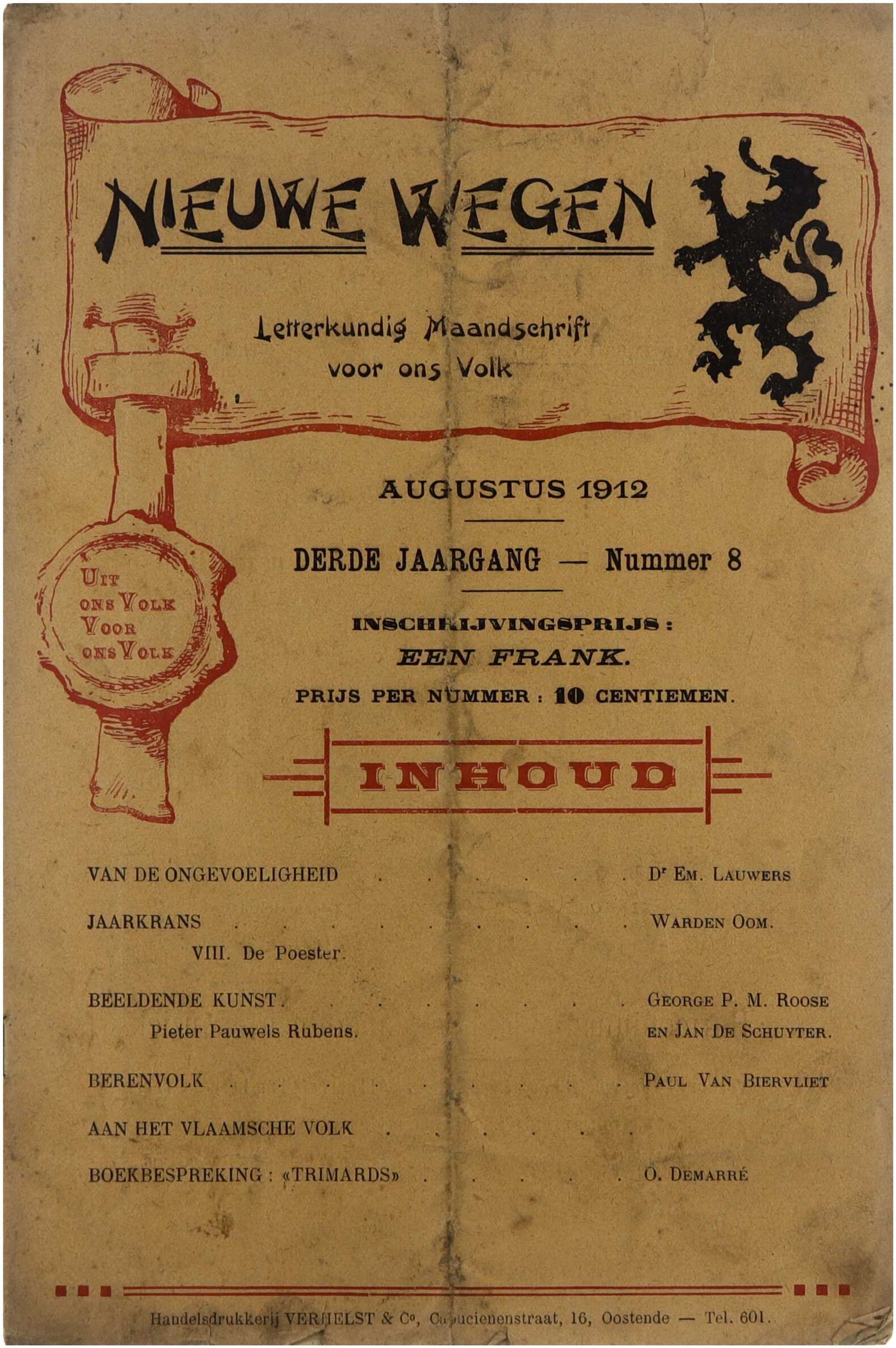 Nieuwe Wegen. Letterkundig maandschrift voor ons volk” is een Nederlandstalig literair tijdschrift. Het tijdschrift bevatte literaire bijdragen en bespiegelingen voor een breed publiek, uitgegeven door A. Gallet in Roeselare. Het fungeert als document van de literaire en culturele context van de Vlamingen in het begin van de 20e eeuw, met diverse auteurs en bijdragen verspreid over het jaar. 10,00 10151712 1 Nieuwe wegen (Derde jaargang -11) Nieuwe wegen. Letterkundig maandschrift voor ons volk (Derde jaargang nummer 11) Warden Oom; Jozef Simons; George Roose; Jan de Schuyter; Paul Van Biervliet; Verhelst (Oostende) 1912 1 0 12 ts nl m 4 Is ooit in twee gevouwen geweest. tijdschrift; literatuur; Vlaams; 1912; cultuur; maandschrift; Roeselare; Gallet Nieuwe Wegen. Letterkundig maandschrift voor ons volk” is een Nederlandstalig literair tijdschrift. Het tijdschrift bevatte literaire bijdragen en bespiegelingen voor een breed publiek, uitgegeven door A. Gallet in Roeselare. Het fungeert als document van de literaire en culturele context van de Vlamingen in het begin van de 20e eeuw, met diverse auteurs en bijdragen verspreid over het jaar.