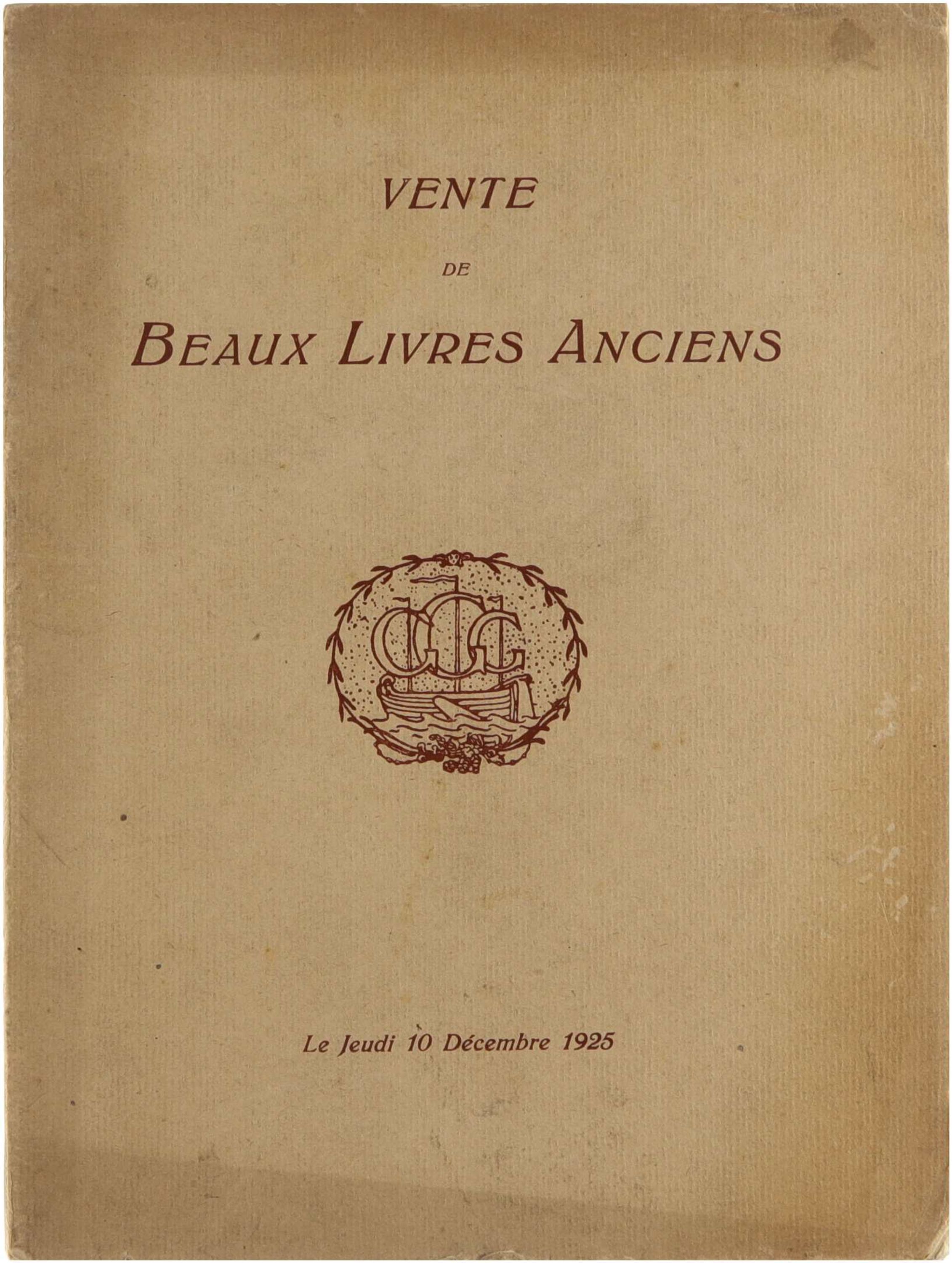 Vente, le jeudi 10 décembre 1925. Ce catalogue de vente aux enchères présente une collection de beaux livres anciens provenant du cabinet d’un bibliophile, avec descriptions bibliographiques, caractéristiques matérielles et valeur culturelle des ouvrages proposés.