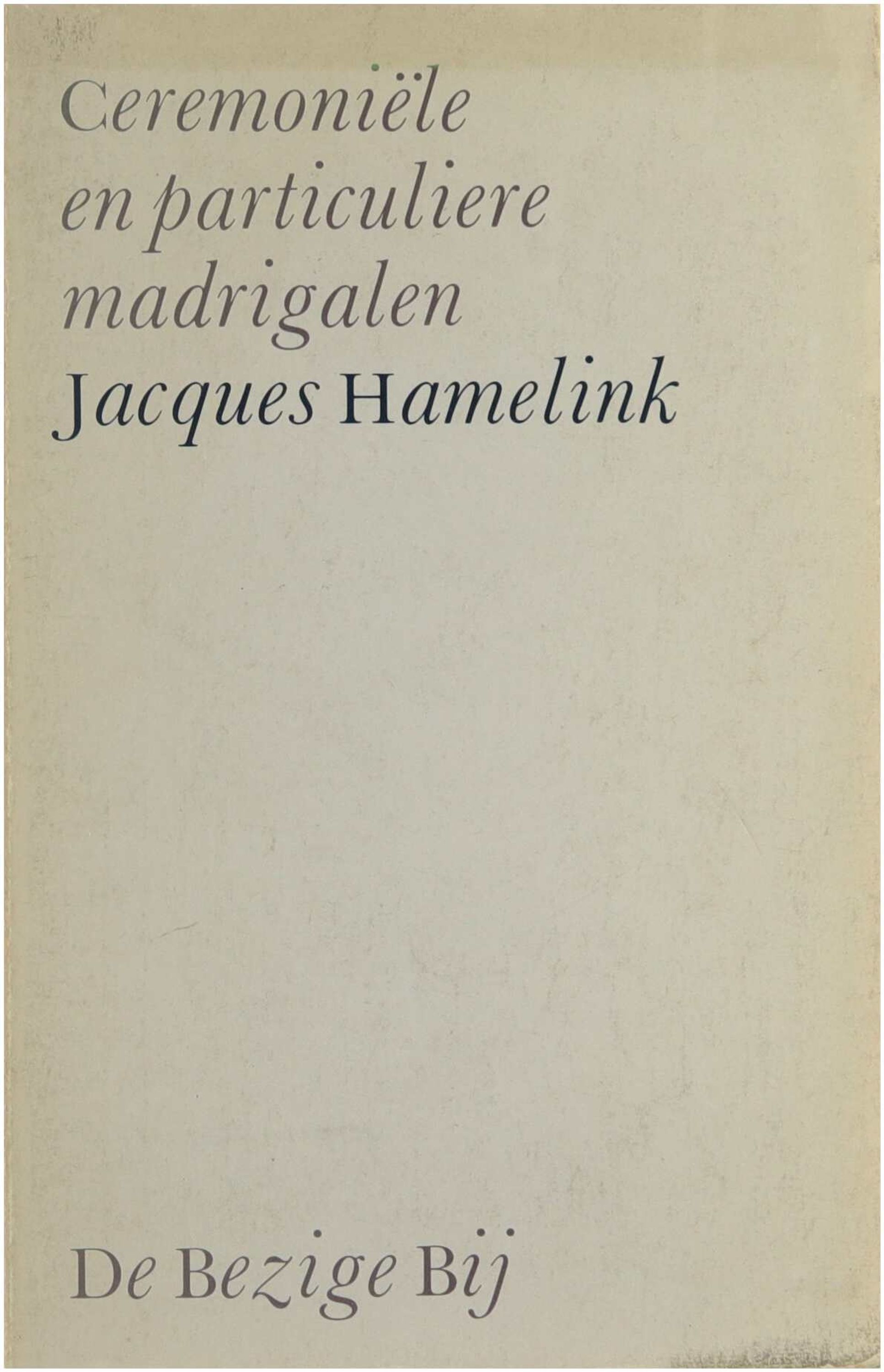 Try, will our table turn? Robert Browning, A Lovers’ Quarrel. Copyright © 1982 Jacques Hamelink, Amsterdam. Druk Thiemes Nijmegen. ISBN 90 234 5374 4. Inhoud: Poste restante 7 — Afwezig: Huis, tuin 11; Afwezig 12; Gemengde berichten 13; Het enkelbeeld 14; Ansicht 15; Cadens 16; Vindplaats 17; Forsythia 18 — De Moorse tuin: De moorse tuin 21; Souvenir 22; Changement de décor 23; Richting Alcoy 24; Wandeling voorbij de Esplanade 25; Murcia, sol y sombra 26 — Van dag tot dag: Van dag tot dag 29; Surge 30; Vinkeveense Plassen 31; Op een pier 32; Hemisferen 33; Tarantella 34; Trompe l’oeil 35 — Blijvend: De pauw of de zwaan 39; De lukrake mus 40; Winteruitverkoop in Antwerpen 41; Over en weer 42; Residua 43 — Voorjaarsvuurwerk 45.
