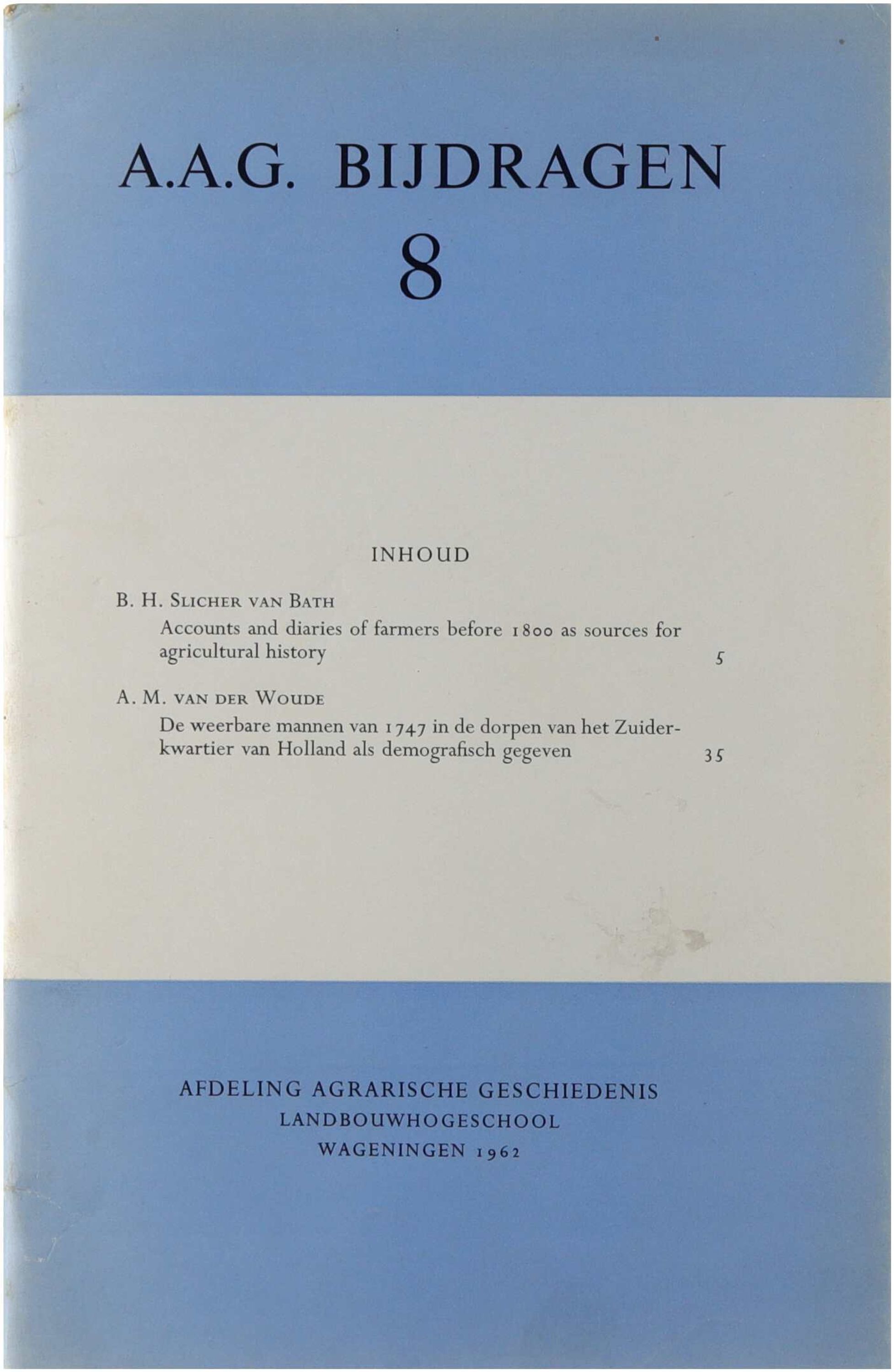 Deze bundel uit de reeks A.A.G. Bijdragen bevat twee studies over agrarische en demografische geschiedenis van de Nederlanden. In het eerste artikel onderzoekt B.H. Slicher van Bath hoe boerenrekeningen en dagboeken van vóór 1800 gebruikt kunnen worden als bronnen voor de studie van landbouwproductie en plattelandseconomie. Het tweede artikel van A.M. van der Woude analyseert de zogenoemde weerbare mannen van 1747 in de dorpen van het Zuiderkwartier van Holland en gebruikt deze gegevens als demografische bron voor de studie van bevolking en militaire organisatie in de achttiende eeuw.