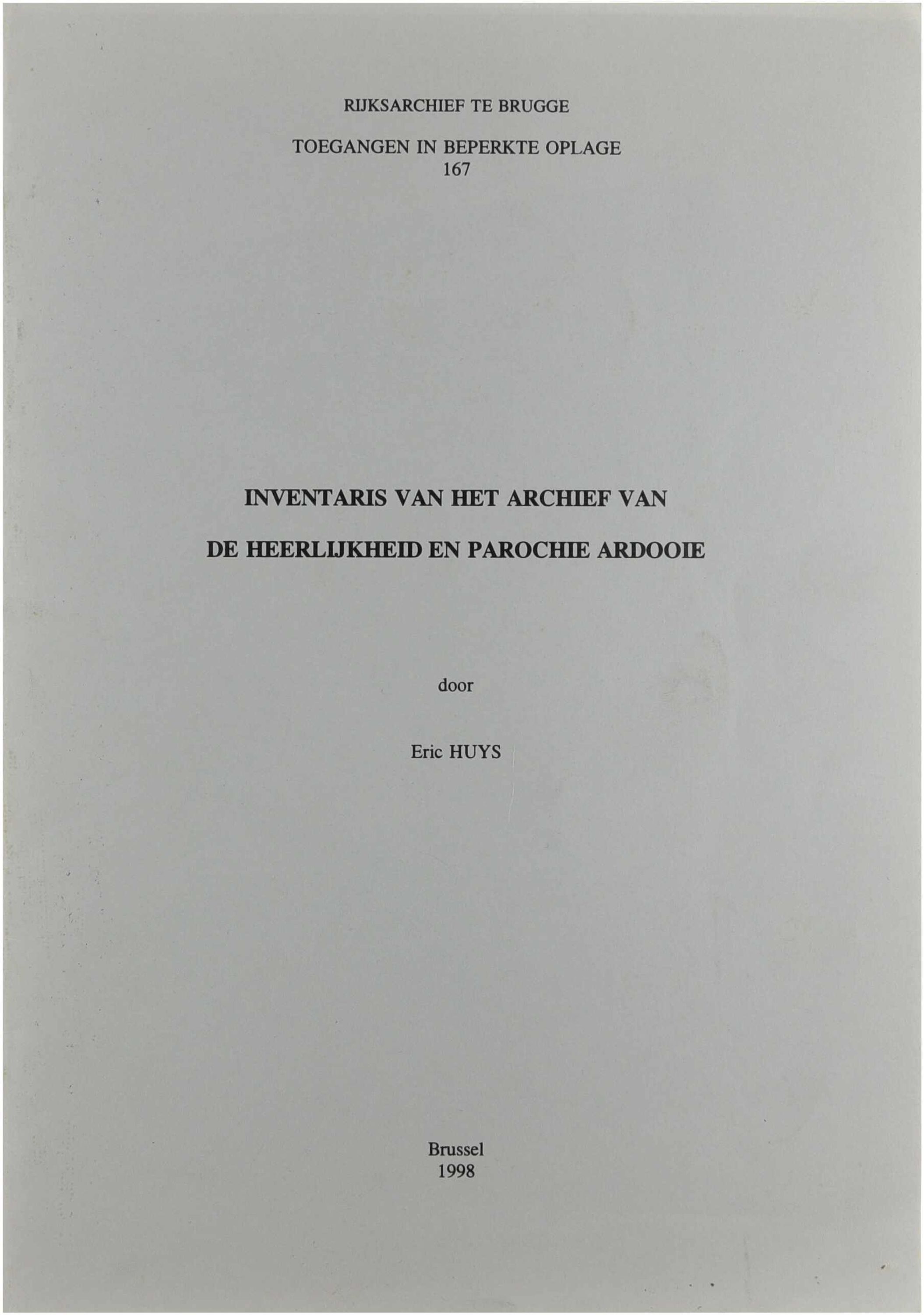 Deze inventaris beschrijft het archief van de heerlijkheid en parochie Ardooie en biedt een systematisch overzicht van de bewaarde archiefstukken. Het werk bevat gedetailleerde beschrijvingen van documenten met betrekking tot bestuur, rechtspraak, eigendom en kerkelijke aangelegenheden, en vormt een belangrijk hulpmiddel voor historisch en genealogisch onderzoek naar de lokale geschiedenis van Ardooie.