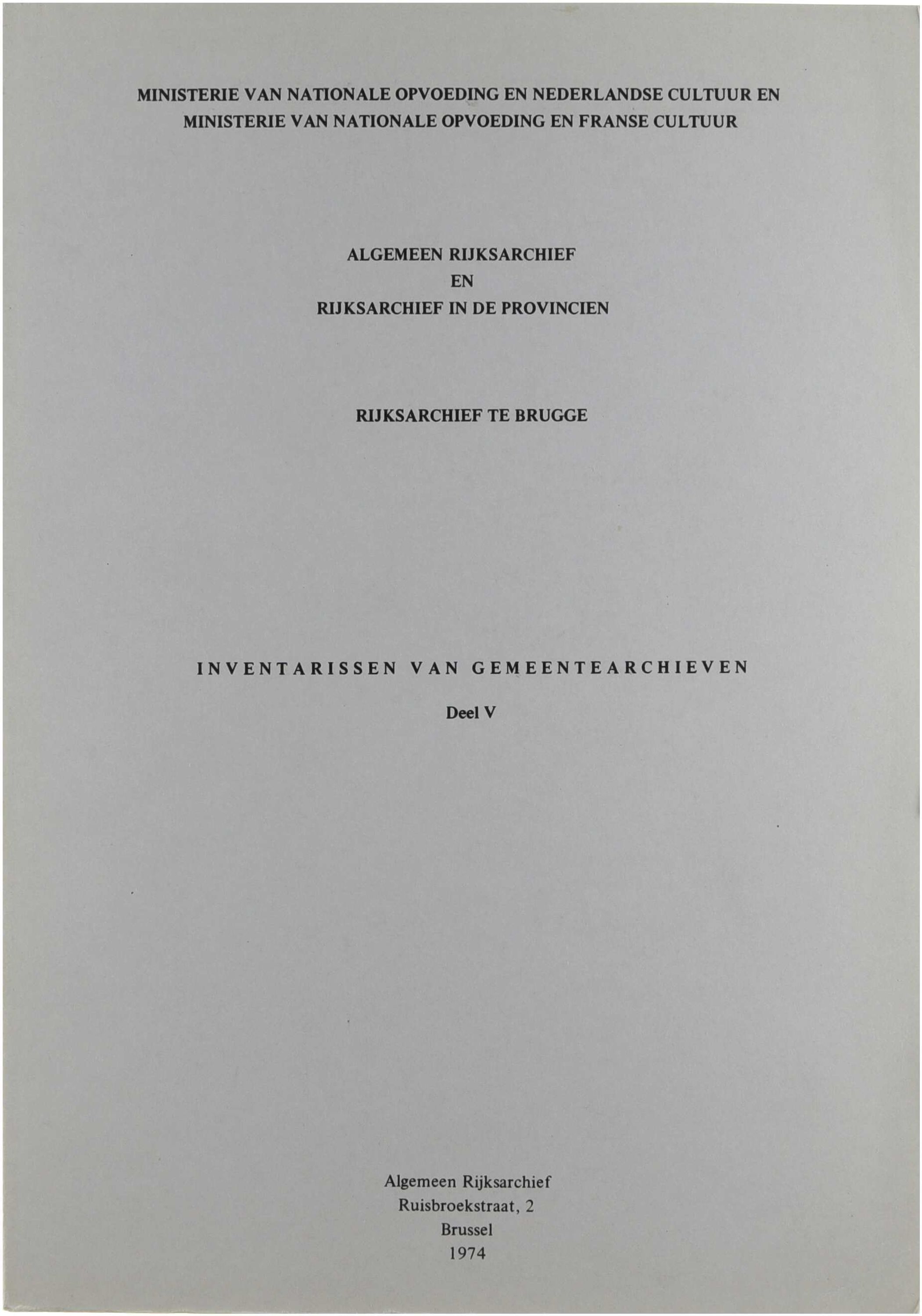 Dit vijfde deel van de inventarissen van de gemeentearchieven in het Rijksarchief te Brugge biedt een systematische beschrijving van de overgedragen archiefbestanden van verschillende gemeenten. Per archieffonds worden de structuur, datering en inhoud van de documenten uiteengezet, waaronder registers, administratieve dossiers, besluiten, correspondentie en financiële stukken. Het werk vormt een essentieel naslaginstrument voor onderzoek naar lokaal bestuur, sociale geschiedenis en administratieve organisatie in West-Vlaanderen.