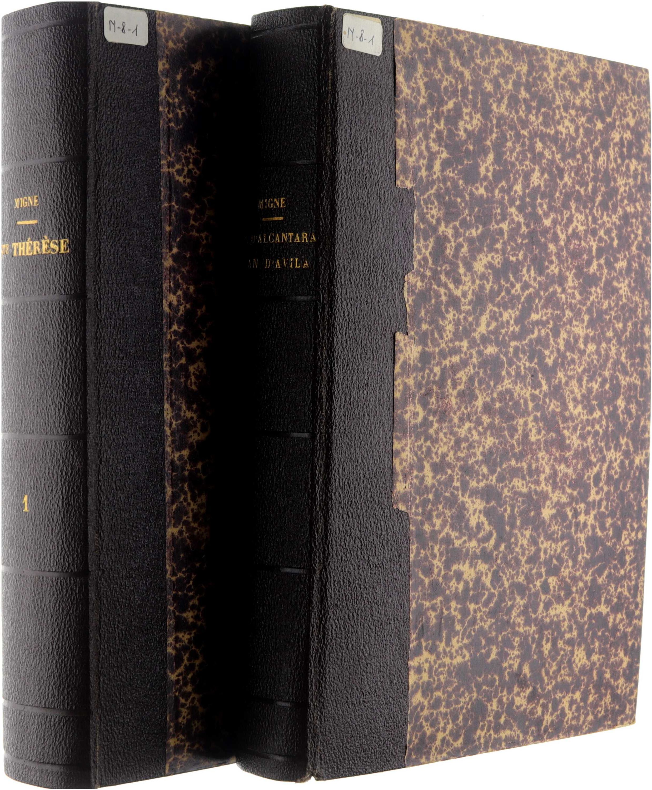 précédées du portrait de la Sainte par Th. Blanchard, du fac-simile de son ecriture par Bineteau, de sa vie par Villefore, et de la bulle de sa canonisation par Gregoire XV suivies d'un grand nombre de lettres inédites, les meditations sur ses vertus par le Cardinal Lambruschini, de son eloge par Bossuet et par fra Louis de Léon, du discours sur le non-quiétisme de la Saint par Villefore des uvres completes de S. Pierre d'Alcantara, de S. Jean de la Croix et du Bienheureux Jean D'avila. 1. Sommaire Tome Premier: SOMMAIRE DES MATIÈRES CONTENUES DANS CE VOLUME. Vie de sainte Thérèse par M. Villefore. Bulle de sa Canonisation par Grégoire XV. Vie de sainte Thérèse par elle-même. Méditations sur le Pater. Méditations après la communion. Le Chemin de la Perfection. Le Château de l’Ame. Imprimerie MIGNE, au Petit-Montrouge. 2. Sommaire Tome Quatrième: SOMMAIRE DES MATIÈRES CONTENUES DANS CE VOLUME. OEUVRES DU B. JEAN D’AVILA. LETTRES ÉCRITES A DES PERSONNES DE TOUTE CONDITION, DIVISÉES EN QUATRE LIVRES. TRAITÉ INTITULÉ : AUDI, FILIA, ET VIDE. MÉDITATIONS SUR LES VERTUS DE SAINTE THÉRÈSE, PAR LE CARDINAL LAMBRUSCHINI. Imprimerie MIGNE, au Petit-Montrouge.