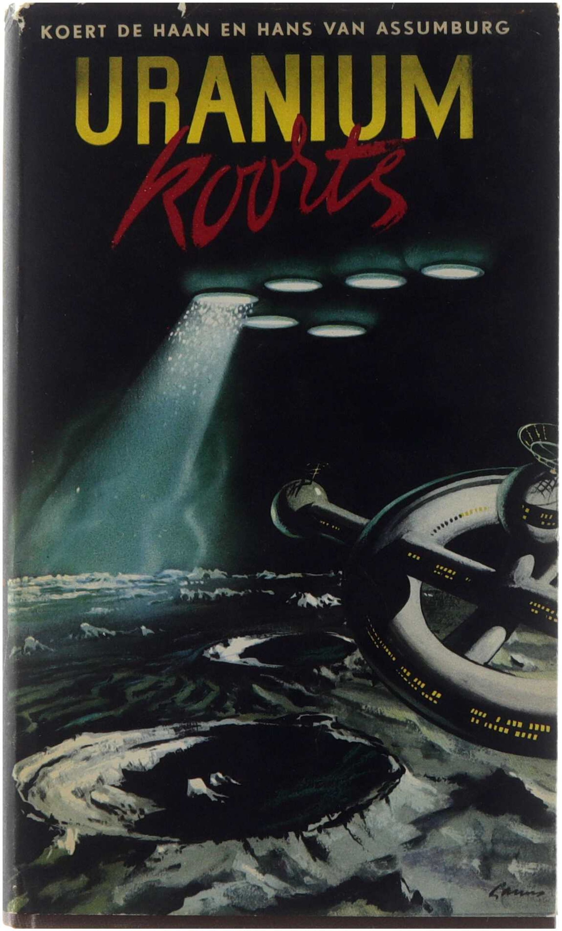 Nu de dagbladen bijna dagelijks melding maken van „vliegende schotels" en men binnen afzienbare tijd de eerste ruimtevluchten met al dan niet bemande „spaceships" tegemoet kan zien, wordt de belangstelling der mensheid in steeds stijgende mate gewekt voor de mogelijkheden en problemen, die in zulk een onderneming verborgen kunnen liggen. In „Uraniumkoorts" zijn de auteurs Koert de Haan en Hans van Assumburg er in geslaagd ons op suggestieve wijze in een wereld te plaatsen, waarin de problemen der ruimtevaart overwonnen moeilijkheden zijn, doch waar men de technische en astronomische wereld van dat ogenblik mobiliseert om tot een verdere exploitatie van het heelal te komen. De hoofdpersoon in deze wereld van 1996 is captain George Donovan Scott, een scherpzinnig medewerker van de United Nations Information Service. Onder de doortastende en bezielende leiding van zijn chef, dr. Arend Vandenberg, bindt hij de strijd aan met de ILOW, een op totalitaire beginselen drijvende, ondergrondse terreur-organisatie, wier doel het is zich van de wereld-heerschappij meester te maken door het veroveren van alle, in de wereld van 1996 bekende, uranium-bronnen. Het grootste project op het gebied der ruimtevaart sinds het Wereldvredesverdrag van 1964, de ruimtevlucht naar de planeet Venus, komt door het drijven van de ILOW op losse schroeven te staan. Zal het captain Scott en de zijnen lukken deze belangrijke expeditie tot een goed einde te brengen? Het antwoord op die vraag wordt U in dit spannend boek gegeven. Maar „Uraniumkoorts" is meer dan een spannend verhaal. Deze „science-fiction-novel" geeft U 'n toekomstbeeld, dat wel fantastisch, doch niet ongelijnd is. De schrijvers hebben bij hun schildering van het einde der twintigste eeuw voortgebouwd op de huidige stand der wetenschap en — wat nog belangrijker is — zij hebben hun geschiedenis gebaseerd op de grootste waarden in het menselijk bestaan: vrede en vrijheid.