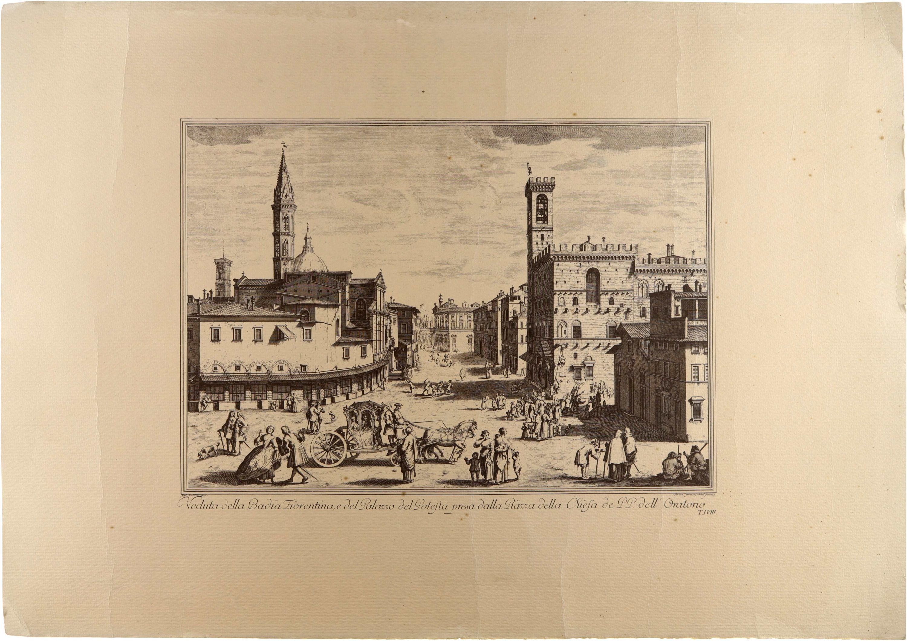 Copia! Incisione settecentesca raffigurante la Badia Fiorentina e il Palazzo del Podestà (oggi Bargello) a Firenze, vista dalla piazza presso la chiesa dei Padri dell’Oratorio. L’immagine fa parte della celebre serie di ventiquattro vedute della città disegnate da Giuseppe Zocchi e incise da Vincenzo Franceschini. La serie documenta con grande precisione architettonica le principali piazze, chiese e palazzi di Firenze nel XVIII secolo ed è considerata una delle più importanti raccolte di vedute della città.