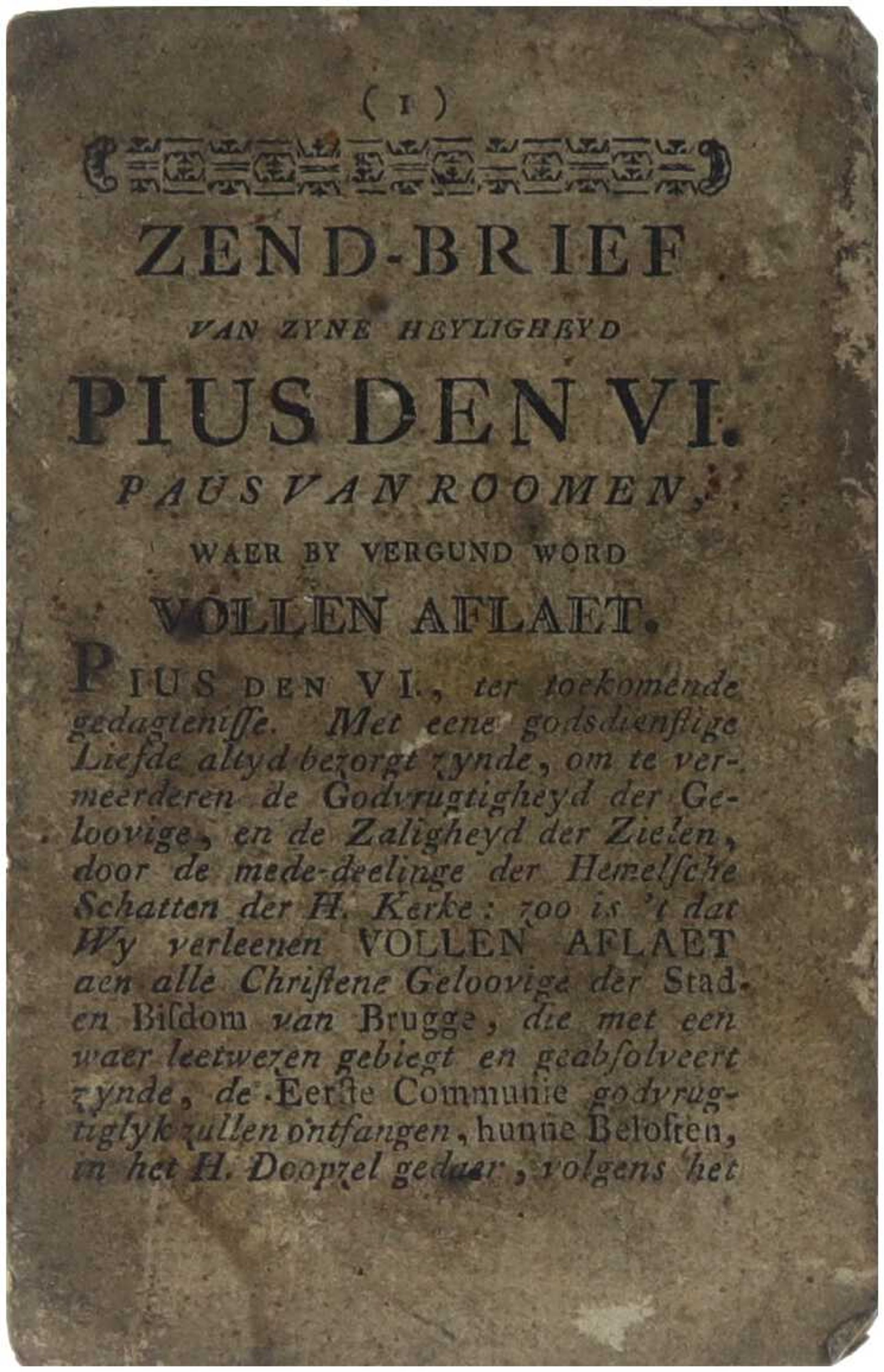 Deze zendbrief bevat een officiële pauselijke afkondiging van paus Pius VI waarin aan de gelovigen een volle aflaat wordt verleend onder bepaalde voorwaarden. Het drukwerk is opgesteld in achttiende-eeuws Vlaams en was bedoeld voor publieke bekendmaking en religieuze instructie. Dergelijke zendbrieven speelden een belangrijke rol in het kerkelijk leven van de Oostenrijkse Nederlanden en dienden ter bevordering van devotie, boetedoening en trouw aan de pauselijke autoriteit.