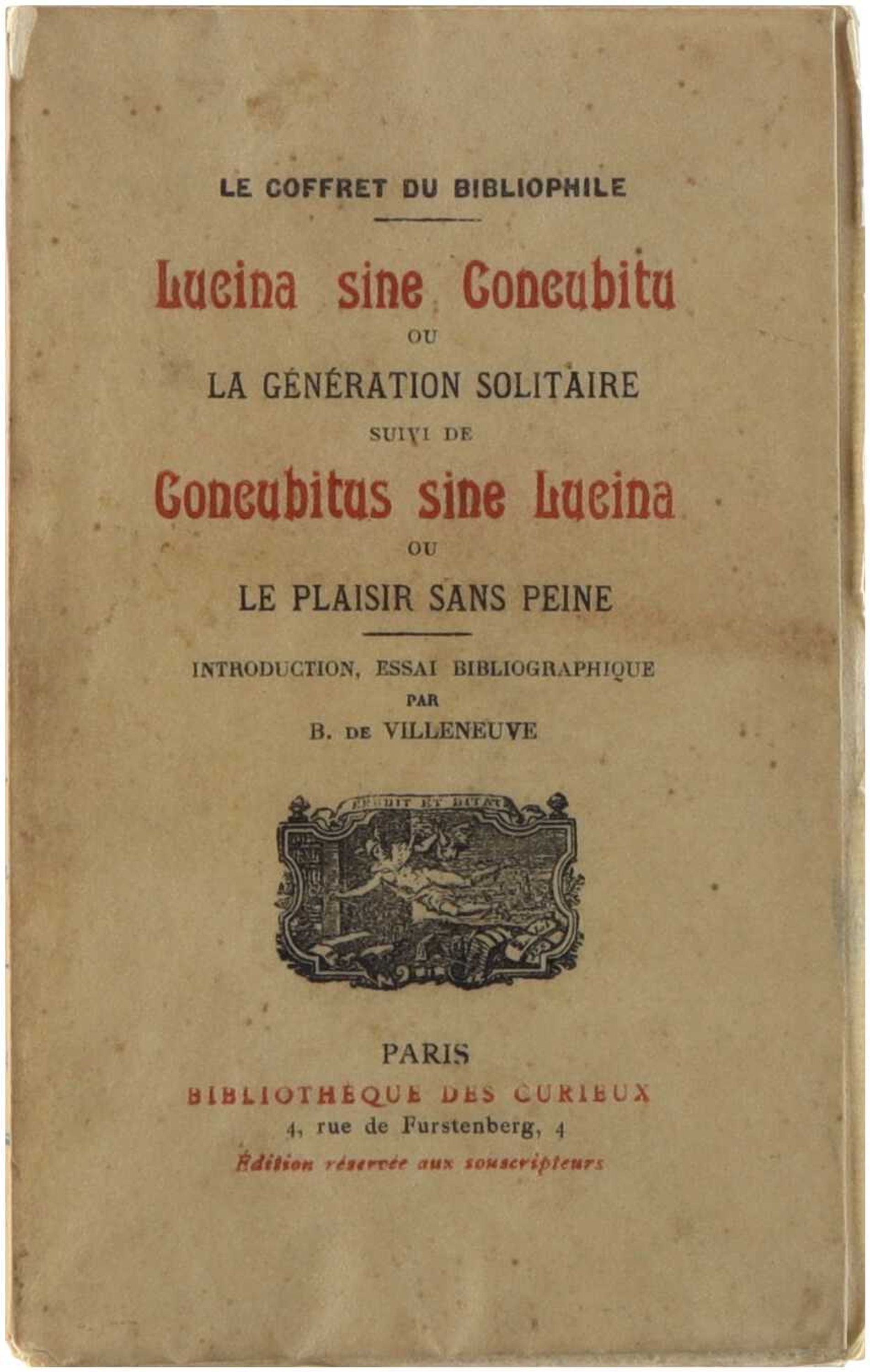 Texte satirique et libertin du XVIIIe siècle, présenté ici en réédition bibliophilique. Lucina sine concubitu (littéralement “Lucine sans concubitus”) traite, sur un ton mi-savant, mi-ironique, de la “génération solitaire”, c’est-à-dire de la reproduction sans coït. Le texte se moque des débats médicaux et moraux de l’époque et en fait une apologie déguisée de la masturbation et de la procréation “miraculeuse”. Il est suivi du Concubitus sine Lucina ou le plaisir sans peine, pendant ironique qui explore le plaisir sexuel dissocié de la reproduction. Ensemble, les deux opuscules forment une critique parodique et libertine des discours médicaux et religieux sur la sexualité au XVIIIe siècle.
