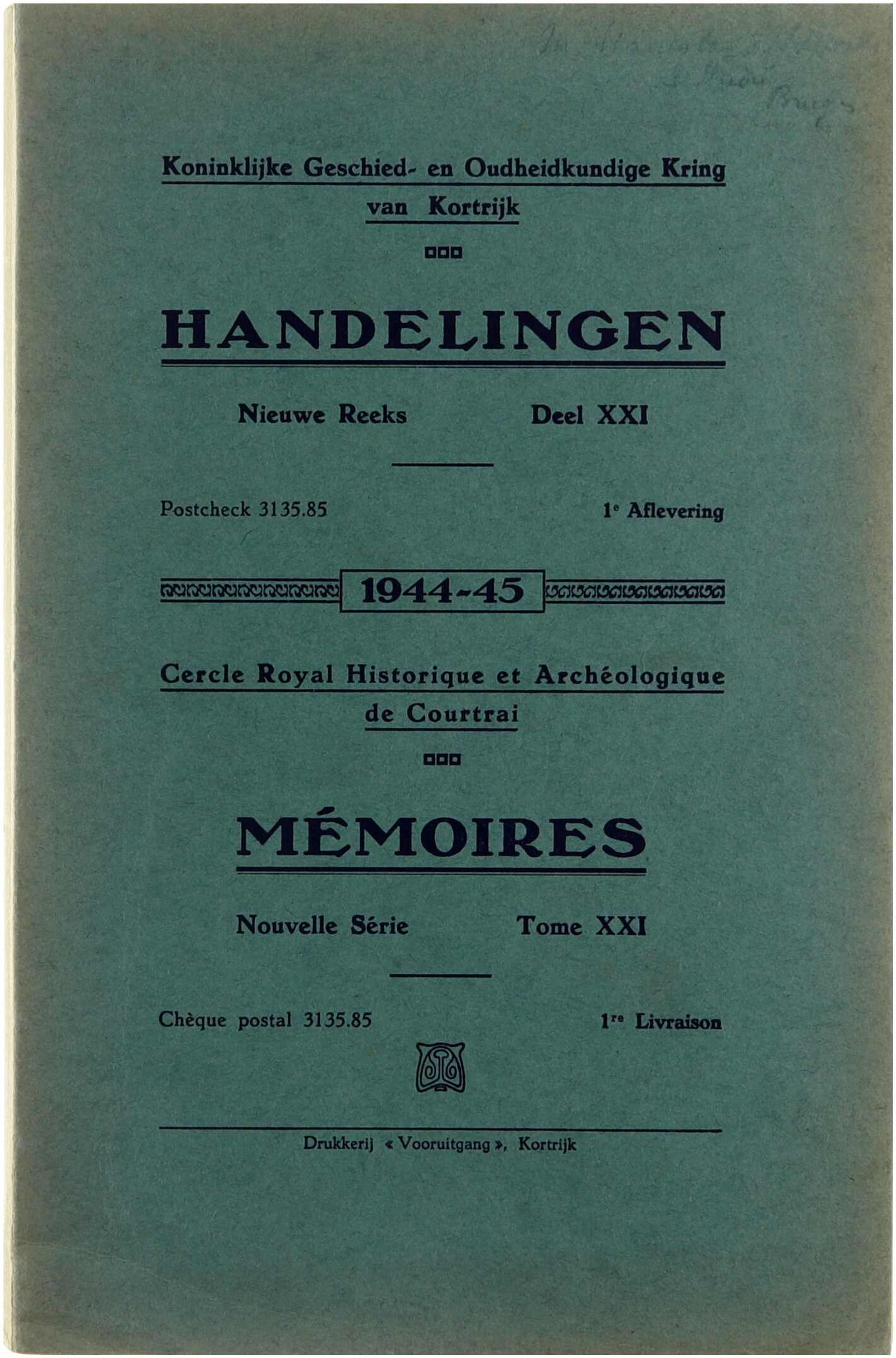 Koninklijke Geschied- en Oudheidkundige Kring van Kortrijk. Handelingen. Nieuwe reeks/Cercle Royal Hisorique et archéologique de Courtrai. Mémoires. 1944-1945/21/1