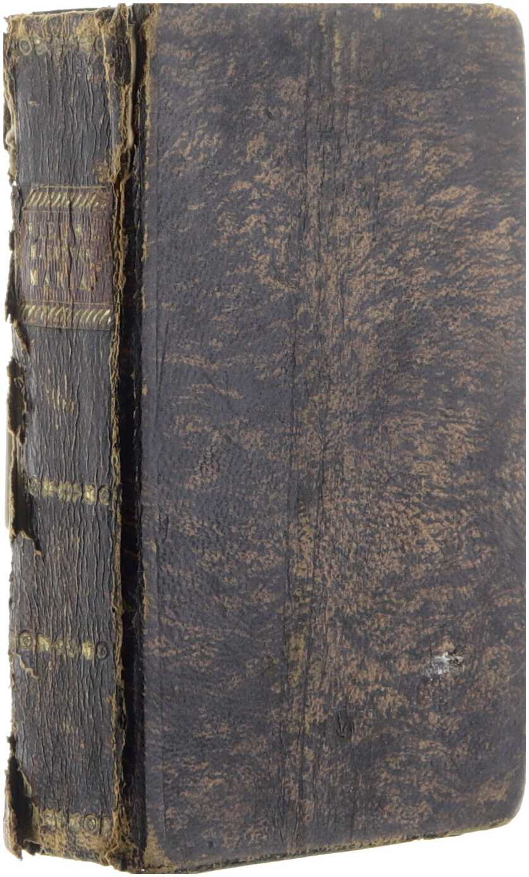 Lederen band, rug los van voor-en achterplat. Voorste schutblad gescheurd. Handgeschreven gebed op achterste schutblad. Frontispice