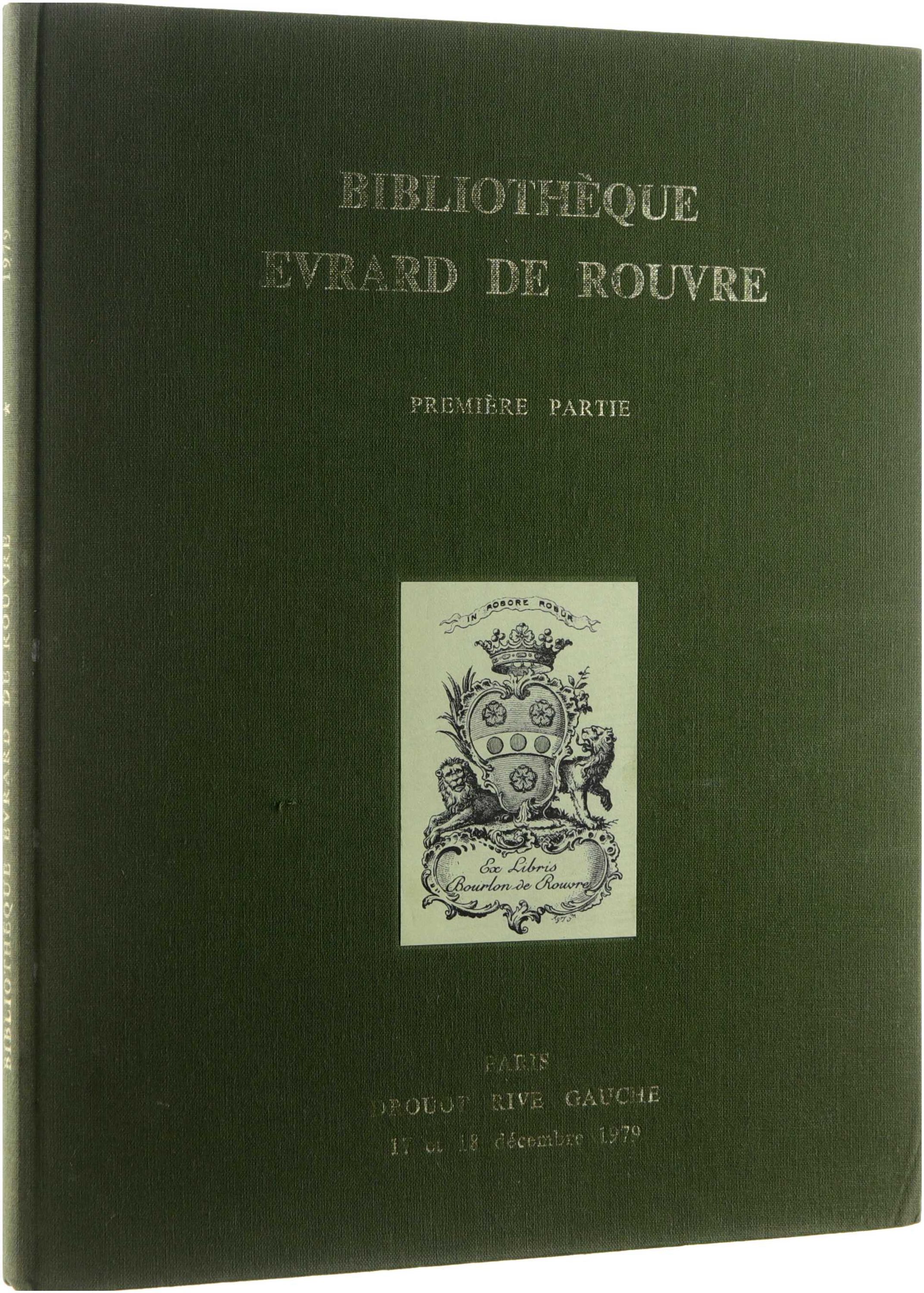 Catalogue de la première partie de la vente de la Bibliothèque Evrard de Rouvre (Drouot, Paris, 17–18 décembre 1979). Il réunit une sélection de très beaux livres illustrés romantiques, des œuvres complètes en reliures romantiques et des livres de voyages. Chaque lot est décrit et reproduit par des planches en couleurs et en noir et blanc; l’ouvrage présente les conditions de vente et la composition de la vacation.