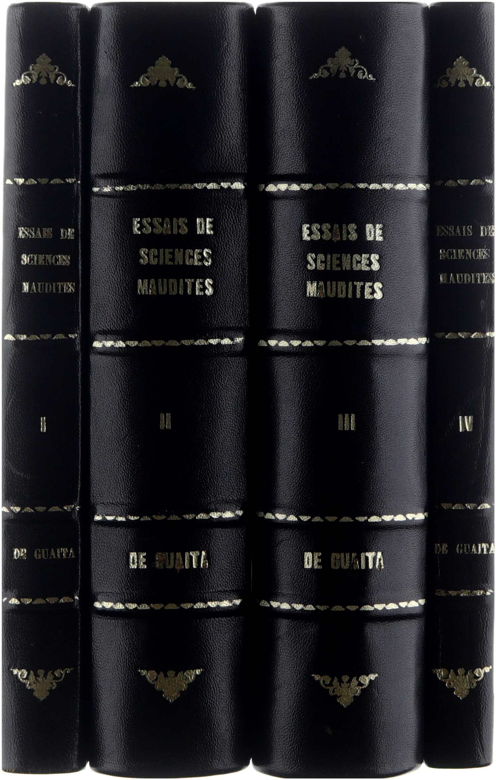 Les quatre volumes forment un ensemble cohérent sur le plan du contenu – les Essais des sciences maudites – mais les blocs-livres proviennent de séries et d’éditions différentes. 1. Stanislas de Guaita, Essais des sciences maudites, Tome I. Au seuil du mystère, avec deux belles figures magiques d’après Henry Khunrath et un appendice, édité par Niclaus, 54 rue Saint-Jacques, Paris, 1963, 223 pages. 2. Stanislas de Guaita, Essais des sciences maudites, Tome II. Le serpent de la Genèse. Première septaine. Livre I. Le Temple de Satan, ouvrage orné de nombreuses gravures, édité par Hector & Henri Durville, 23 rue Saint-Merri, Paris, 1915, 573 pages. 3. Stanislas de Guaita, Essais des sciences maudites, Tome III. Le serpent de la Genèse. Seconde septaine. Livre II. La Clef de la magie noire, ouvrage orné de nombreuses gravures, édité par Perthuis, 20 boulevard du Montparnasse, Paris, 1967, 847 pages. 4. Stanislas de Guaita & Oswald Wirth, Essais des sciences maudites, Tome IV. Le serpent de la Genèse. Troisième septaine. Livre III. Le Problème du mal, ouvrage orné de nombreuses gravures, édité par les Éditions de la Maisnie, 1975, 173 pages, ISBN 2857070039 / 9782857070030. //Les Essais des sciences maudites constituent une vaste exploration ésotérique des doctrines occultes, de la magie et des forces invisibles qui, selon Stanislas de Guaita, structurent la tradition spirituelle et l’histoire du mal. Le premier tome, Au seuil du mystère, introduit les principes fondamentaux de la magie, la symbolique des forces astrales et les rapports entre l’initié et les puissances invisibles. Le deuxième tome, Le serpent de la Genèse – Première septaine, examine la figure du Serpent comme symbole primordial du savoir interdit et étudie le « Temple de Satan » comme représentation des forces d’ombre et de subversion spirituelle. Le troisième tome, La Clef de la magie noire – Seconde septaine, approfondit l’étude de la magie noire, de ses méthodes, de ses dangers et de ses lois, tout en opposant la voie lumineuse de l’initiation à la chute dans l’« astral inférieur ». Le quatrième tome, Le Problème du mal – Troisième septaine, réunit les réflexions finales de Guaita (complétées par Oswald Wirth) sur l’origine métaphysique du mal, sa manifestation dans l’histoire humaine et son rôle dans l’équilibre cosmique selon les traditions hermétiques et kabbalistiques. Ensemble, les quatre volumes forment une synthèse ambitieuse où se croisent kabbale, hermétisme, symbolisme chrétien ésotérique, démonologie, alchimie et initiations occidentales.// ésotérisme – hermétisme – occultisme – magie – magie noire – kabbale – serpent de la Genèse – dualité lumière/ténèbres – initiation – astral – symbolisme mystique – démonologie – tradition rosicrucienne – métaphysique du mal – forces invisibles – gravures ésotériques – imagerie magique