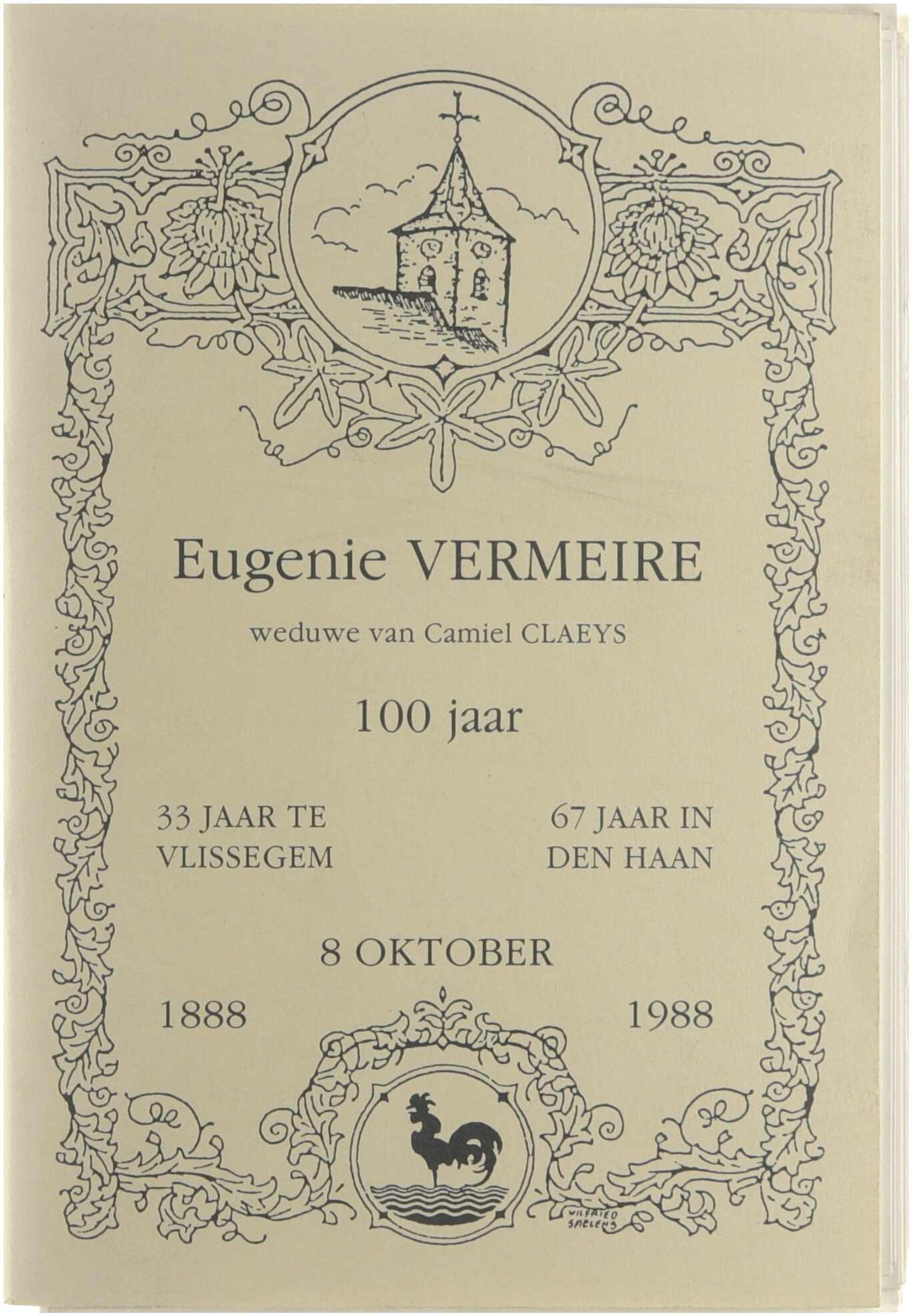 Herinnering ter gelegenheid van de honderste verjaardag van Eugenie Vermeire (geboren te Vlissegem op 8 oktober 1888, sinds 1957 weduwe van Camiel Claeys, woont sinds 1921 in Den Haan. dit is de levensloop, gekruid met een vleugje familiekroniek, een hapje geschiedenis en foto's uit de oude doos.