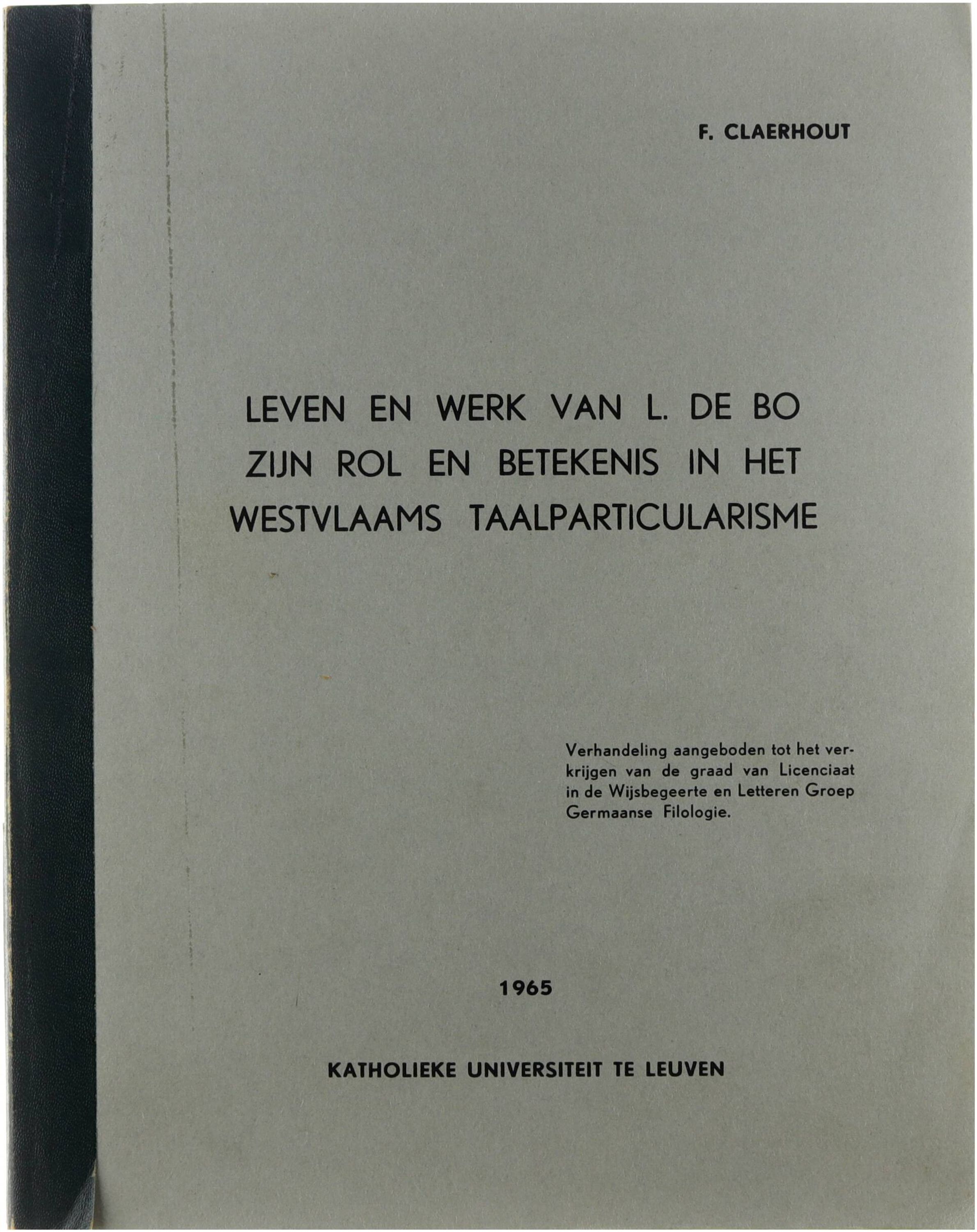 In deze licentiaatsverhandeling onderzoekt F. Claerhout het leven en werk van Leonardus Lodewijk De Bo (1826-1885) als priester, taalkundige en voorvechter van het Westvlaams dialect. Hij belicht De Bo’s rol in het taalparticularisme in West-Vlaanderen — met name zijn lexicografisch werk zoals het Westvlaamsch Idioticon, zijn polemiek over de inbreng van dialectwoorden in de schrijftaal, en zijn bijdrage tot de ontplooiing van een Vlaamse taalbeweging die het taaldebat in de 19e eeuw beïnvloedde.