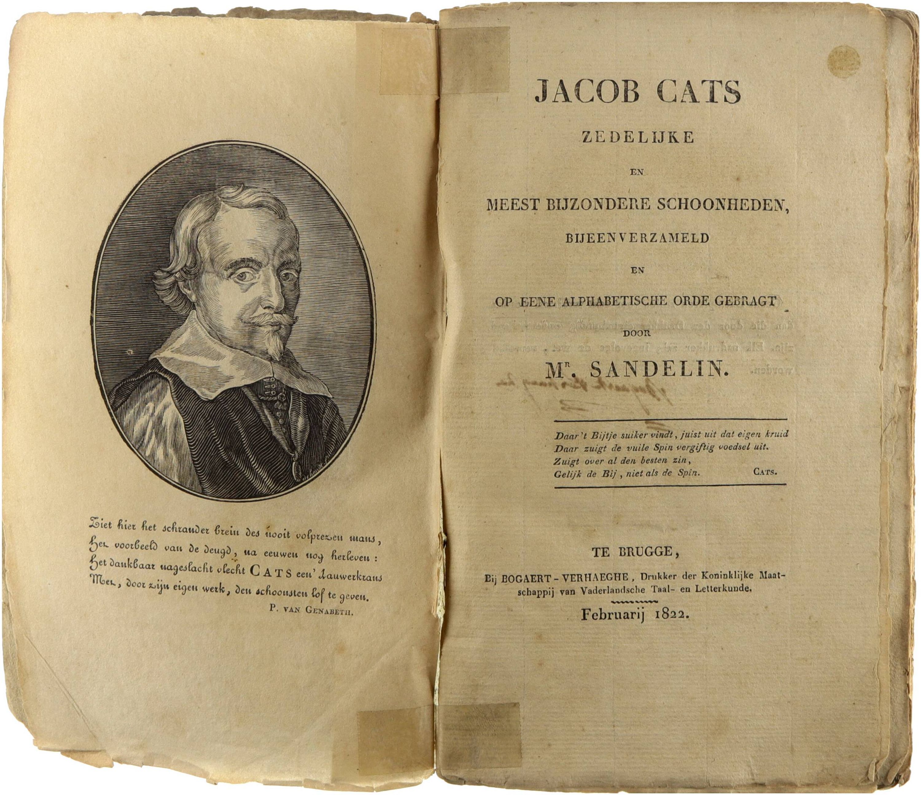 bijeenverzameld en op eene alfabetische orde gebracht. Te Brugge, bij Bogaert- Verhaeghe. Februari 1822. Uitzonderlijke Brugse uitgave van J.Cats, onder Neder- landsche overheersching. Met gegraveerd portret. Originele omslag, hersteld. Om- vangrijk werk van 482 blz. Onafgesneden velijnpapier.