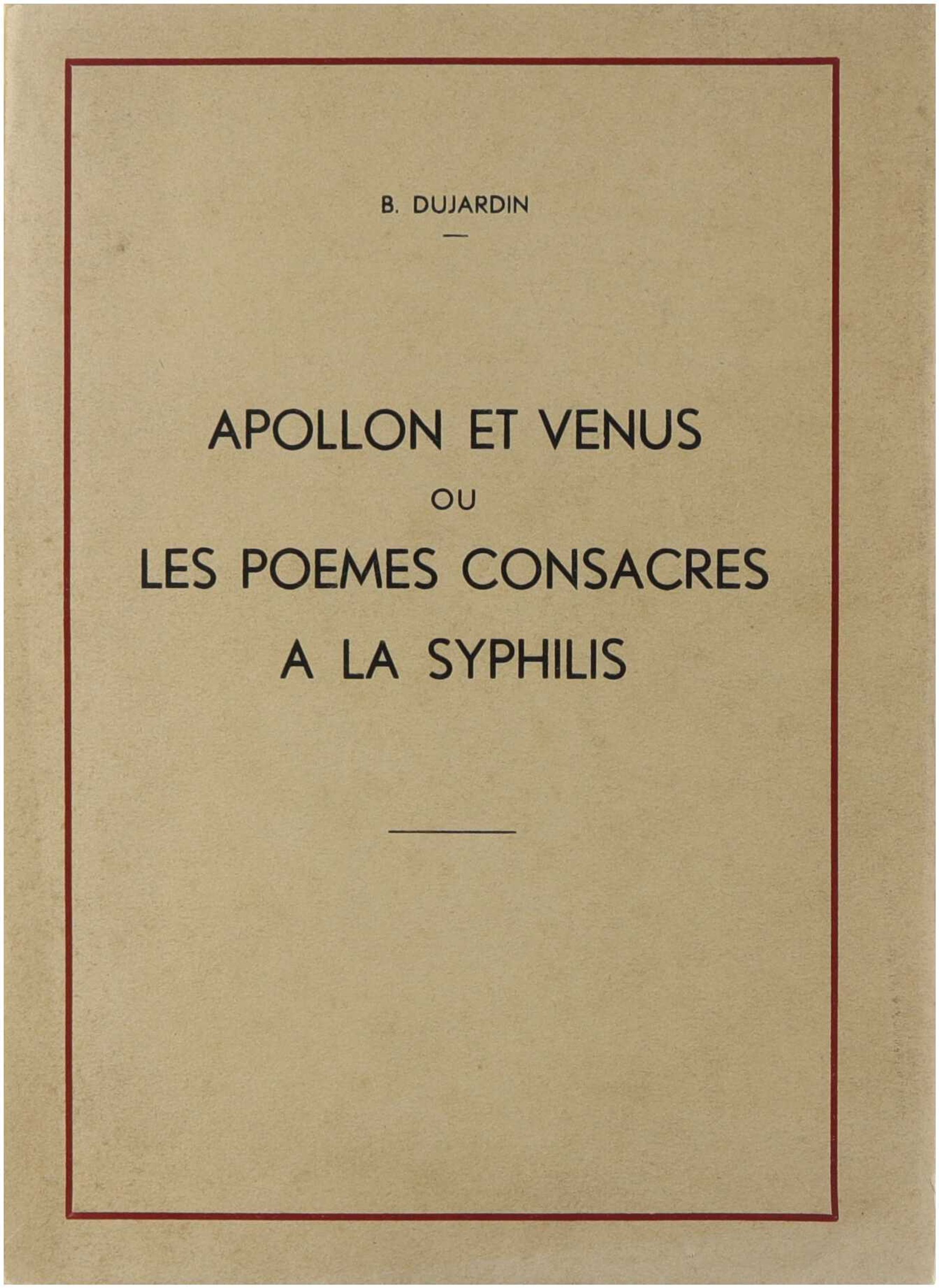 Apollon et Vénus ou les Poèmes consacrés à la syphilis est un recueil poétique de B. Dujardin publié par l’Union Chimique Belge à Bruxelles, qui explore la syphilis à travers une approche littéraire et allégorique, mêlant réflexion morale et esthétique. L’ouvrage met en scène les figures mythologiques d’Apollon et de Vénus pour symboliser la dualité entre beauté, désir et les conséquences tragiques de la maladie, offrant ainsi une perspective originale qui allie culture, poésie et sensibilisation médicale. Composé d’une cinquantaine de poèmes et enrichi de plusieurs illustrations, il illustre la manière dont la littérature pouvait traiter des sujets de santé à la fois avec sérieux et créativité, en abordant la syphilis non seulement comme un problème médical mais aussi comme un thème moral et artistique.