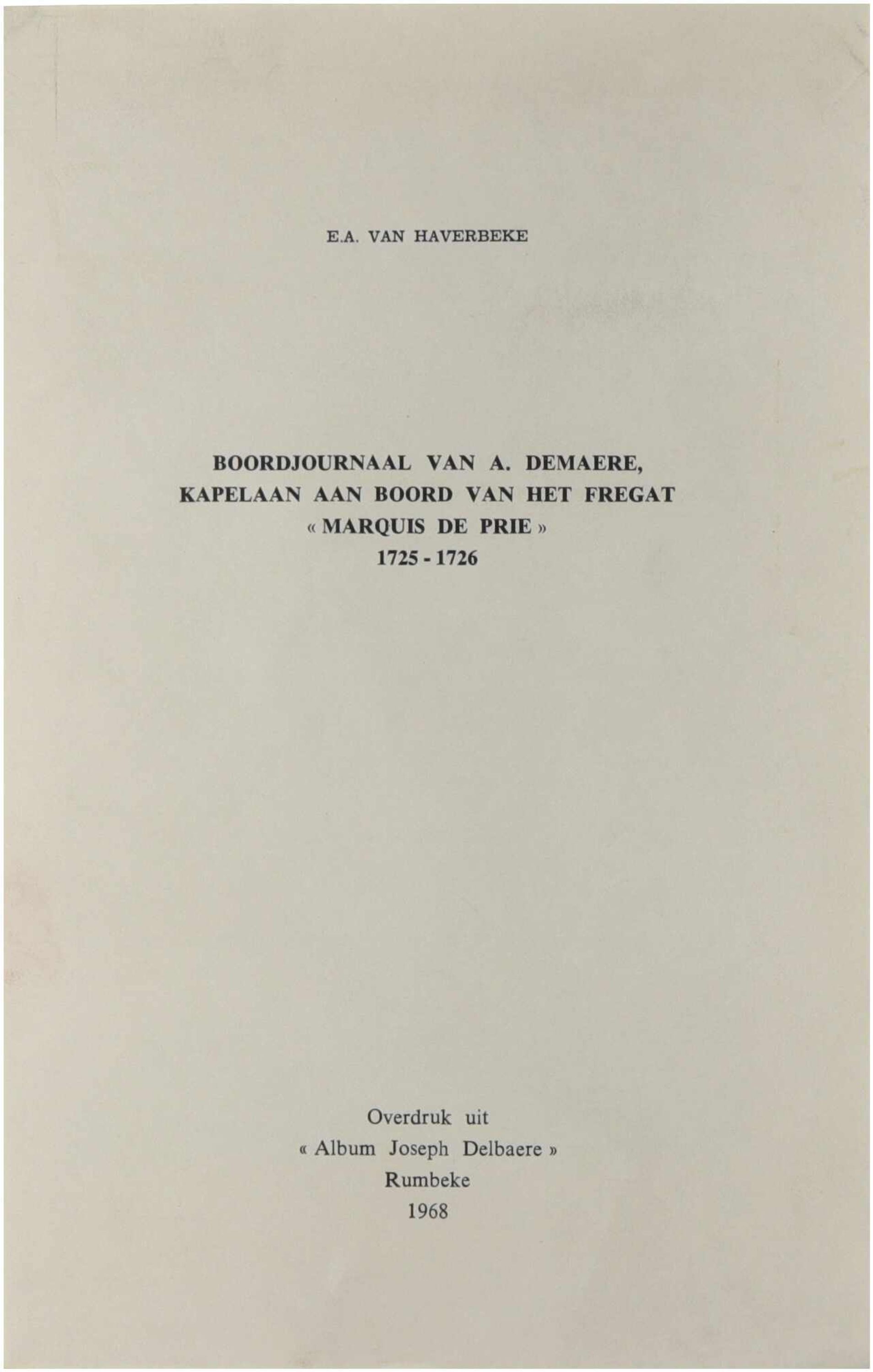 Deze overdruk publiceert en bespreekt het boordjournaal van A. Demaere, die in 1725-1726 als kapelaan verbonden was aan het fregat “Marquis de Prie”. Het document biedt een unieke inkijk in het dagelijkse leven aan boord, de religieuze praktijk op zee en de maritieme context van de vroege achttiende eeuw. De auteur situeert het journaal binnen de bredere geschiedenis van de Zuid-Nederlandse zeevaart en belicht zowel historische als menselijke aspecten van deze zeereis.
