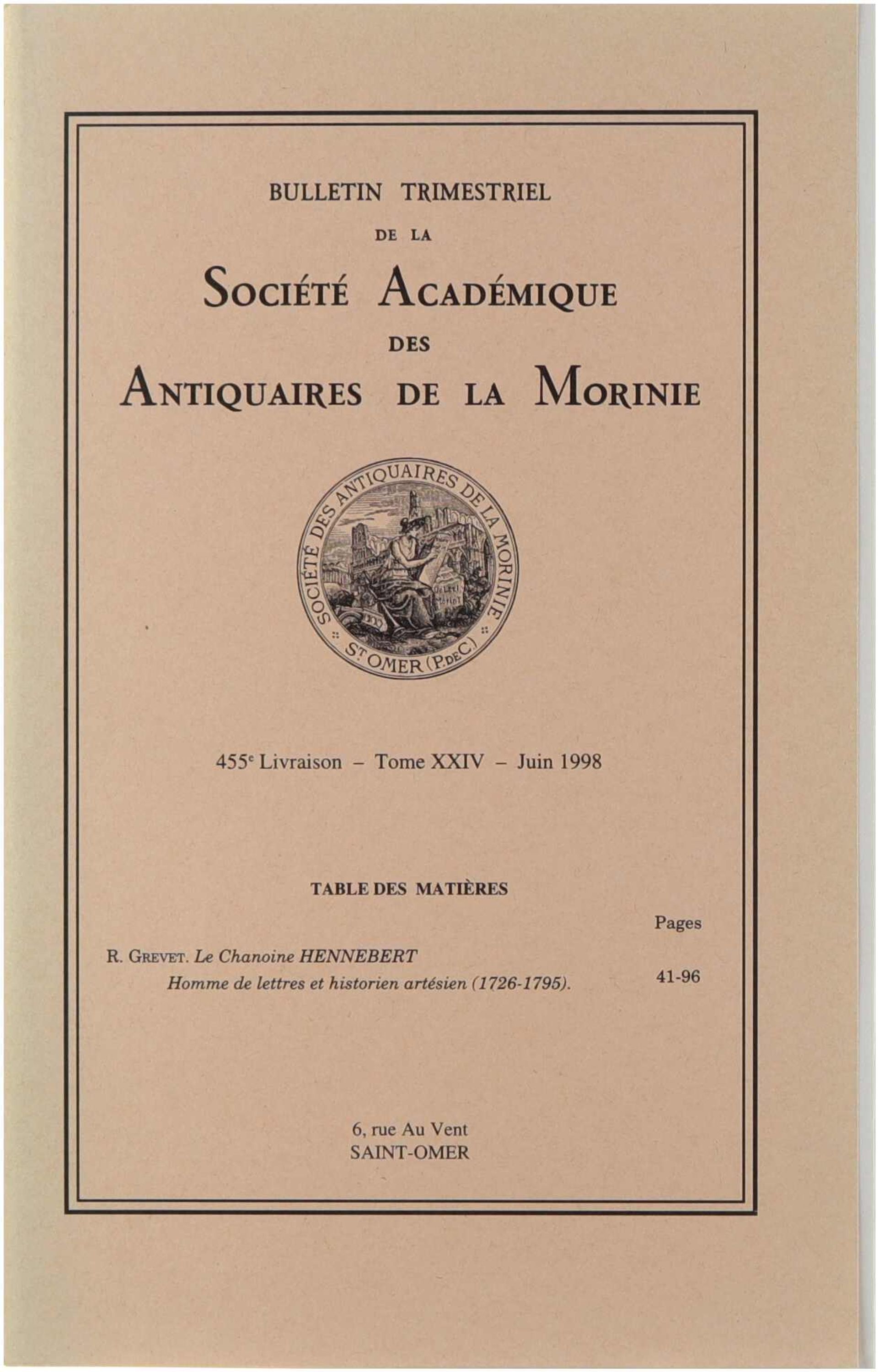 Bulletin trimestriel de la société académique des antiquaires de la Morinie Juin 1998. Le chanoine Hennebert, homme de lettres et historien artésien (1726-1795)