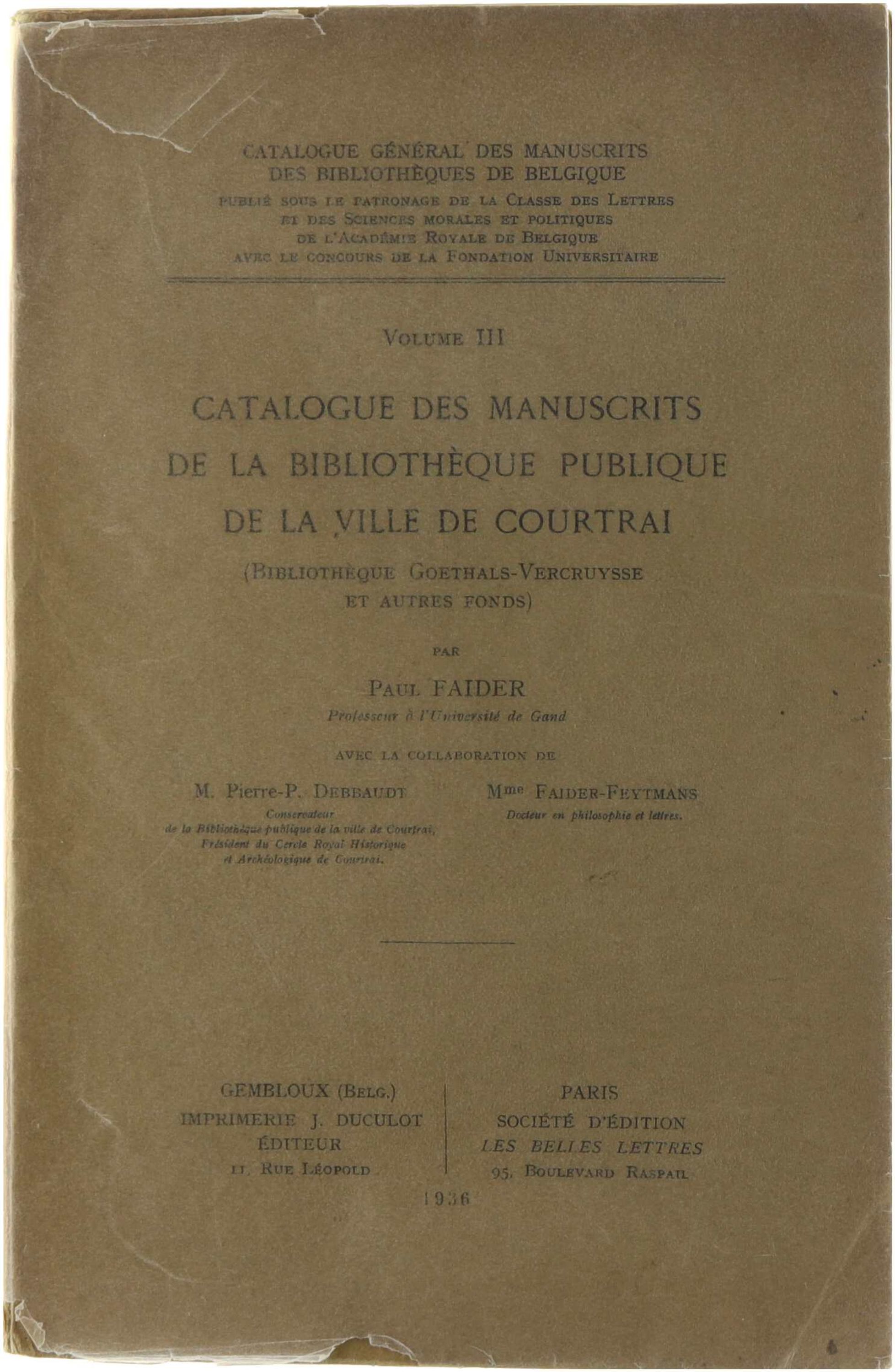 Catalogue des manuscrits de la bibliothèque publique de la ville de Courtai (Bibliothèque Goethals-Vercruysse et autres fonds)