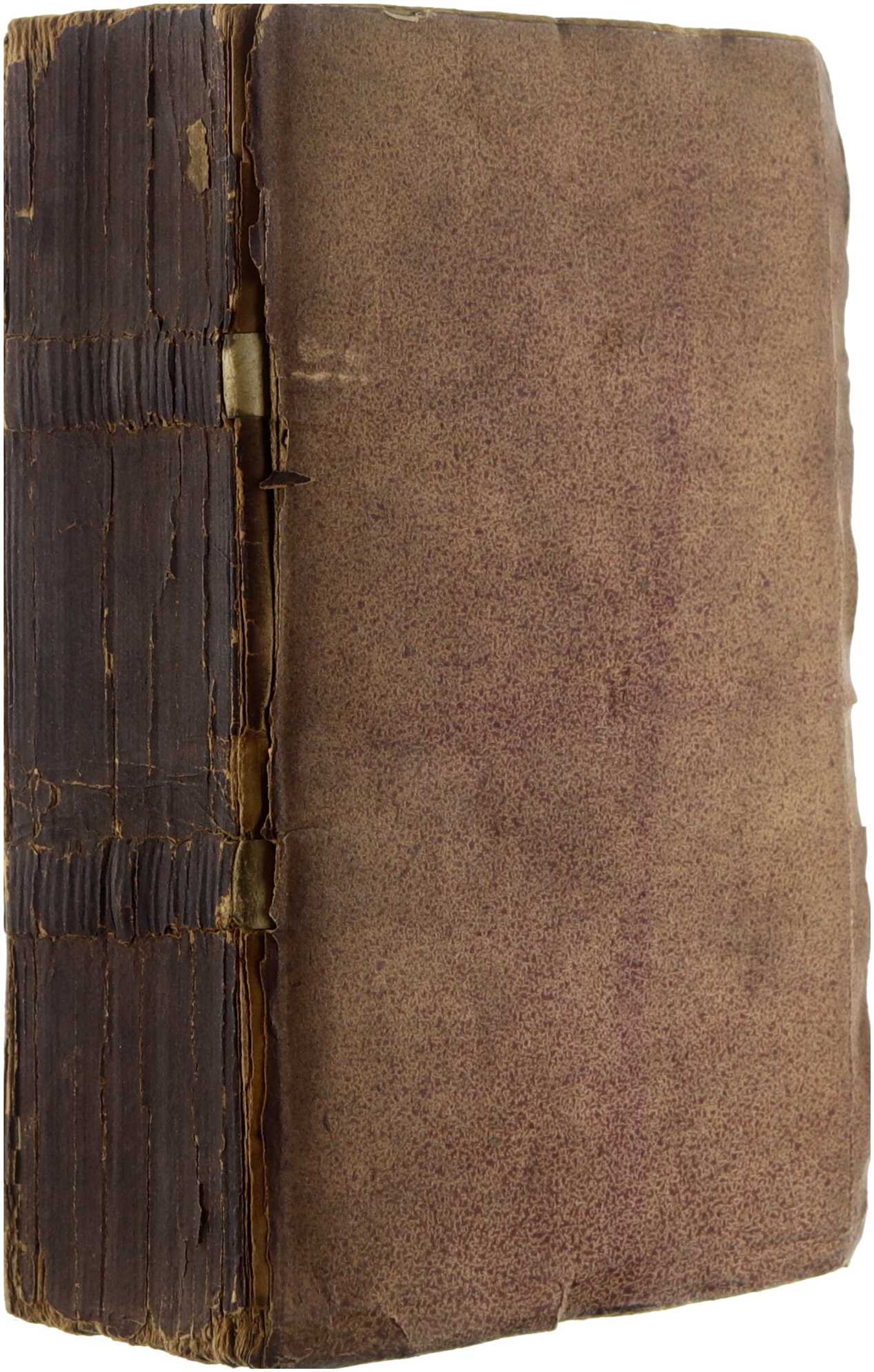Discolouration. Cover with frayed spine, wrinkled paper, discoloured text and edge.