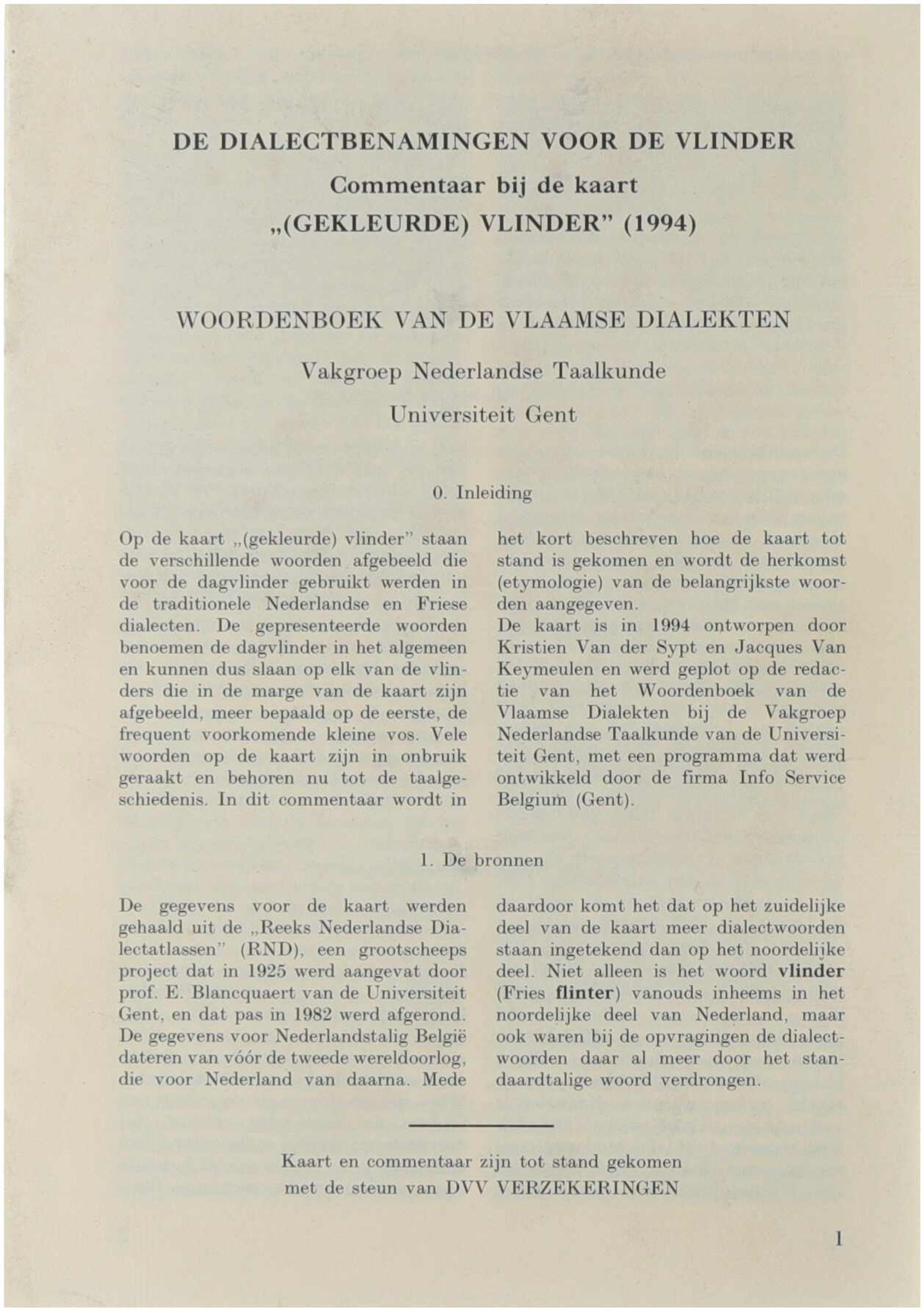Deze studie biedt een taalkundige analyse van de dialectbenamingen voor de vlinder in het Vlaamse taalgebied en vormt de commentaar bij de kaart “(gekleurde) vlinder” binnen het Woordenboek van de Vlaamse Dialecten. De auteur bespreekt de geografische spreiding, etymologie en semantische variatie van de verschillende benamingen en plaatst ze in een breder dialectologisch kader. De publicatie draagt bij tot het inzicht in woordvorming, regionale taalvariatie en de lexicale diversiteit binnen de Nederlandse dialecten in Vlaanderen.