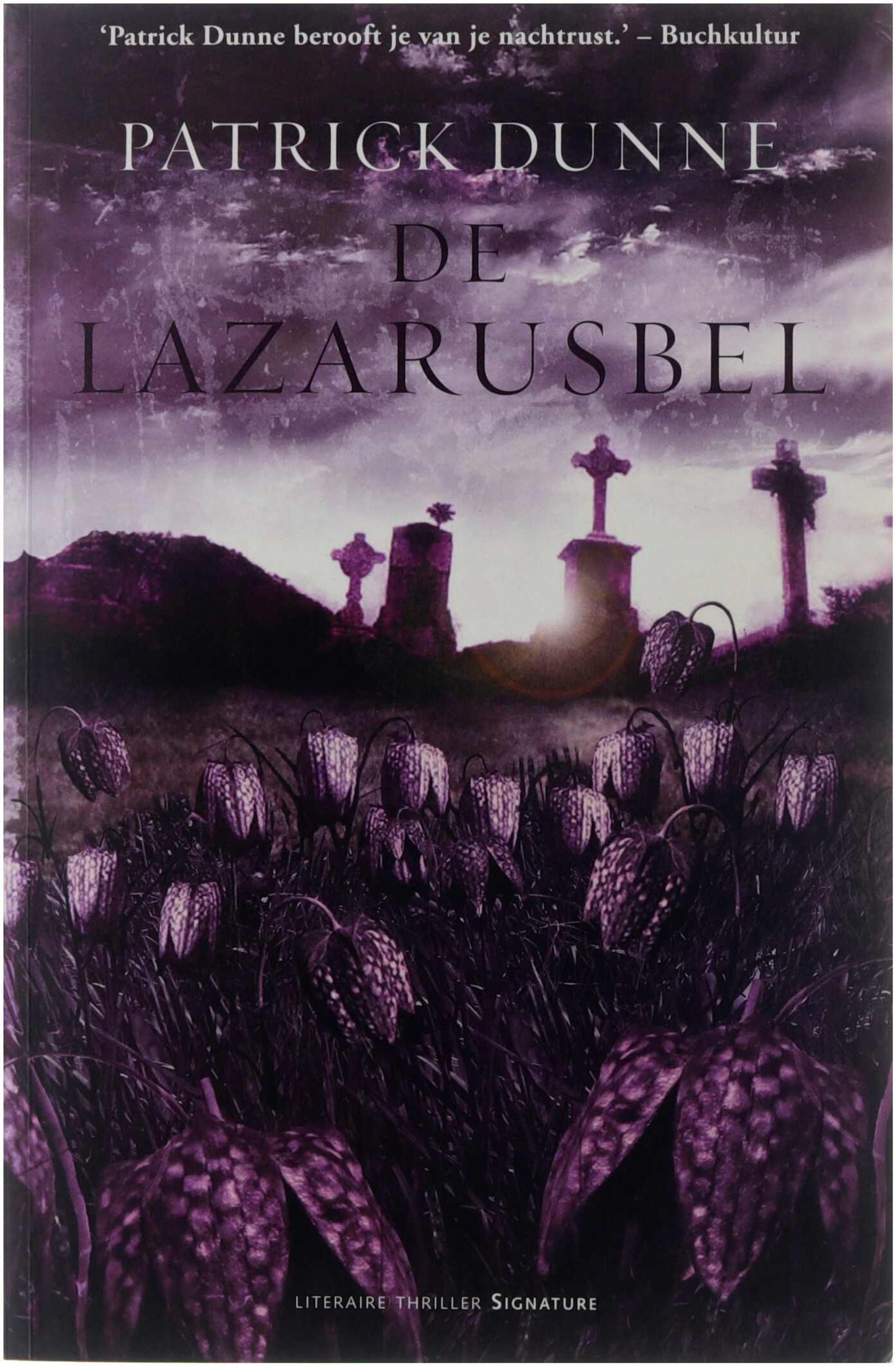 De lazarusbel van Patrick Dunne volgt archeologe Illaun Bowe die bij het opgraven van een prachtig bewerkte houten Madonna op een voormalige pestbegraafplaats stuit op iets wat aanvankelijk een routineklus lijkt maar al snel leidt tot een dodelijke ziekteuitbraak, paniek in het dorp en een quarantaine; terwijl de tabloids de schuld bij immigranten leggen en de spanningen oplopen, wordt Illaun gedreven door schuldgevoelens en nieuwsgierigheid om de achtergronden te ontrafelen, wat samenvalt met de vondst van een mensenromp en een mysterieuze figuur die het beeld koste wat het kost wil hebben, waardoor dit verhaal draait om medische onrust, sociale hysterie, rituele moord en de psychologische druk op de hoofdpersoon in een thriller‑achtige setting.