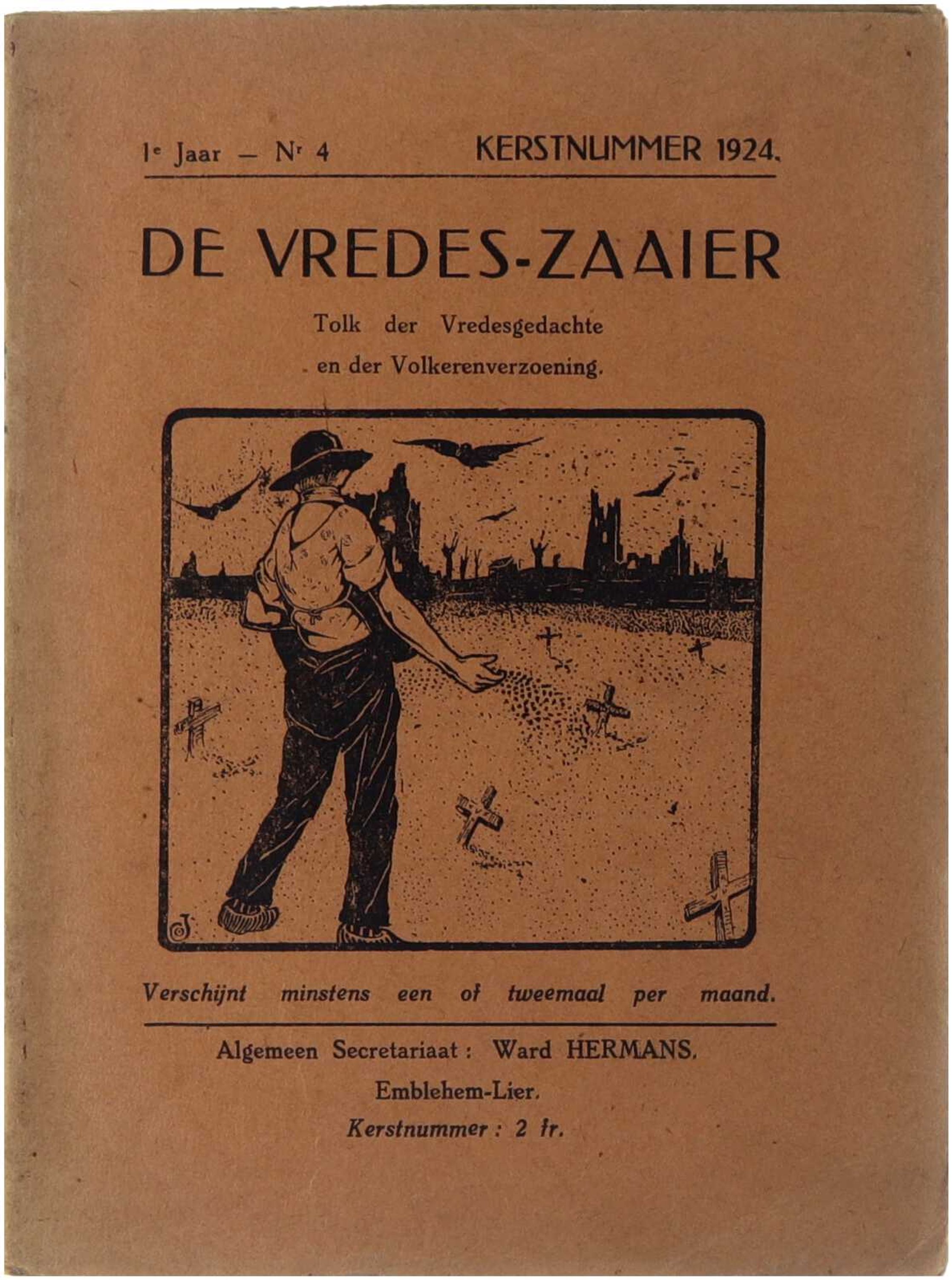 Dit tijdschriftnummer van De Vredes-Zaaier uit december 1924 fungeert als een belangrijke getuige van het naoorlogse Vlaamse activisme en de pacifistische retoriek binnen de Vlaamse Beweging. Onder redactie van de toenmalige voorman Ward Hermans profileerde het blad zich als een vertolker van de vredesgedachte en de verzoening tussen volkeren, waarbij de iconische voorplaat van een zaaier op een slagveld met grafkruisen de hoop op wederopstanding en morele vernieuwing na de Eerste Wereldoorlog symboliseert. De publicatie weerspiegelt de tijdsgeest waarin antimilitarisme vaak hand in hand ging met Vlaams-nationalistische ambities en een diep wantrouwen tegenover de Belgische staat, wat dit specifieke kerstnummer tot een cruciaal document maakt voor de studie naar de ideologische evolutie van radicale Vlaamse denkers in het interbellum.
