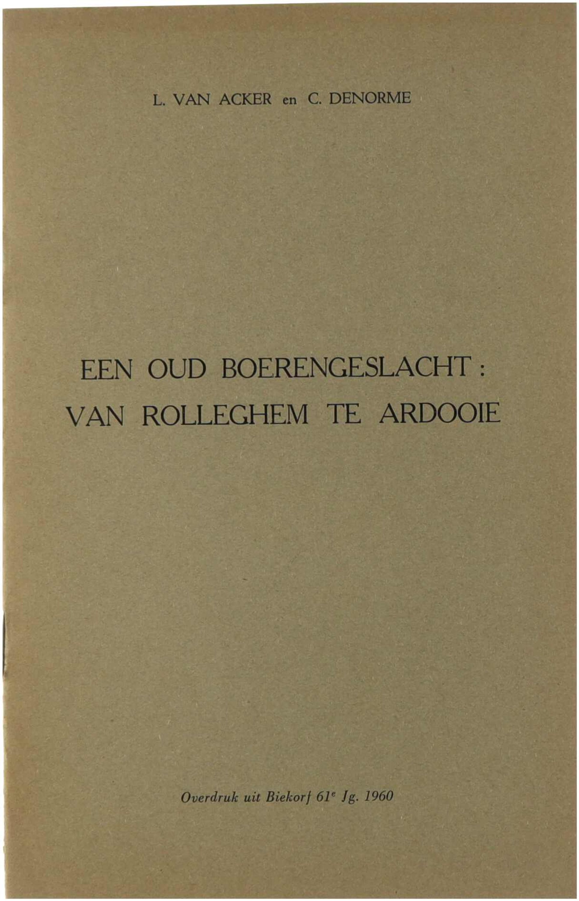 Een oud boerengeslacht: van Rolleghem te Ardooie” is een genealogische en heemkundige studie waarin L. Van Acker en C. Denorme de geschiedenis reconstrueren van het boerengeslacht Van Rolleghem in Ardooie. Op basis van archiefonderzoek wordt de afkomst, familiale ontwikkeling en sociaal-economische positie van de familie geschetst over meerdere generaties. Het artikel belicht tevens het landbouwleven en de dorpsstructuren waarin het geslacht functioneerde en draagt zo bij tot de kennis van de plattelandsgeschiedenis in West-Vlaanderen. De bijdrage verscheen oorspronkelijk in het tijdschrift Biekorf en werd later als overdruk verspreid.