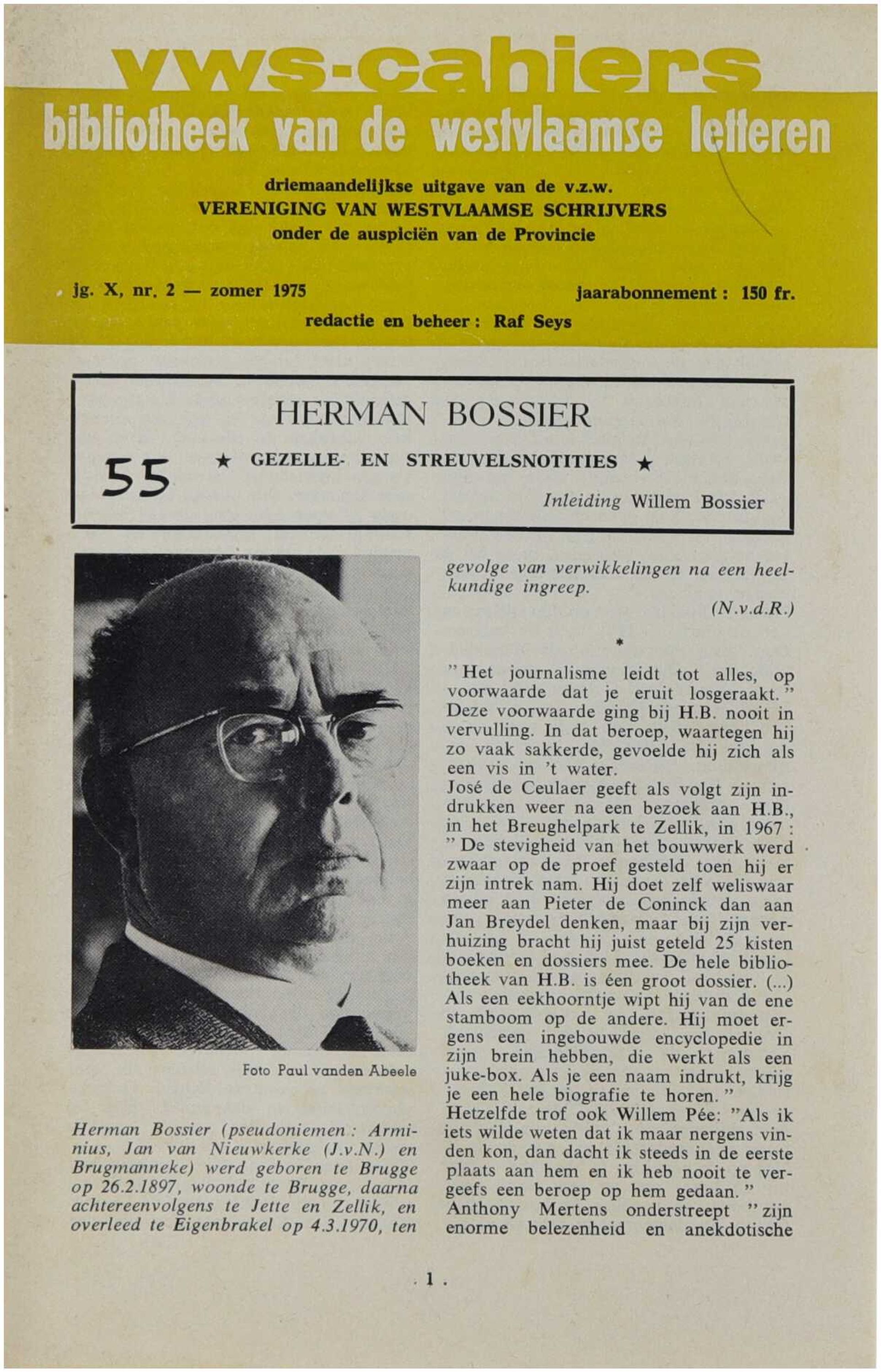 Dit cahier is gewijd aan het leven en het literaire oeuvre van een West-Vlaamse schrijver en biedt een biografisch en kritisch overzicht van diens betekenis binnen de regionale en Vlaamse literatuur. Aan de hand van levensgegevens, thematische bespreking en situering binnen de literaire context wordt het schrijverschap belicht, met aandacht voor stijl, thematiek en culturele achtergrond. De uitgave kadert binnen de doelstelling van de VWS-cahiers om het literaire erfgoed van West-Vlaanderen te documenteren en toegankelijk te maken.