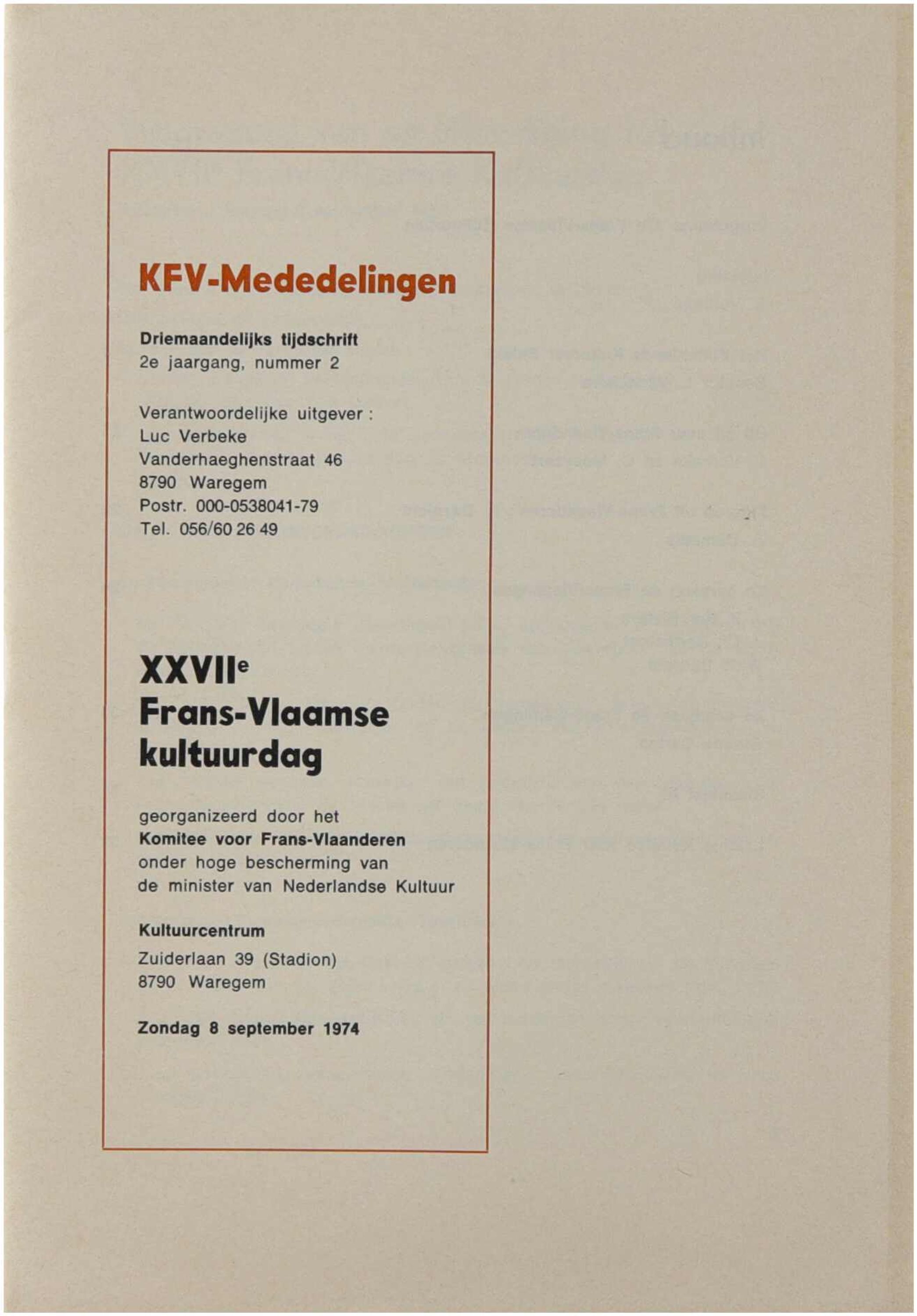 KFV-Mededelingen. Driemaandelijks tijdschrift 2 nr 2. XXVII) Frans-Vlaamse kultuurdag 8 september 1974