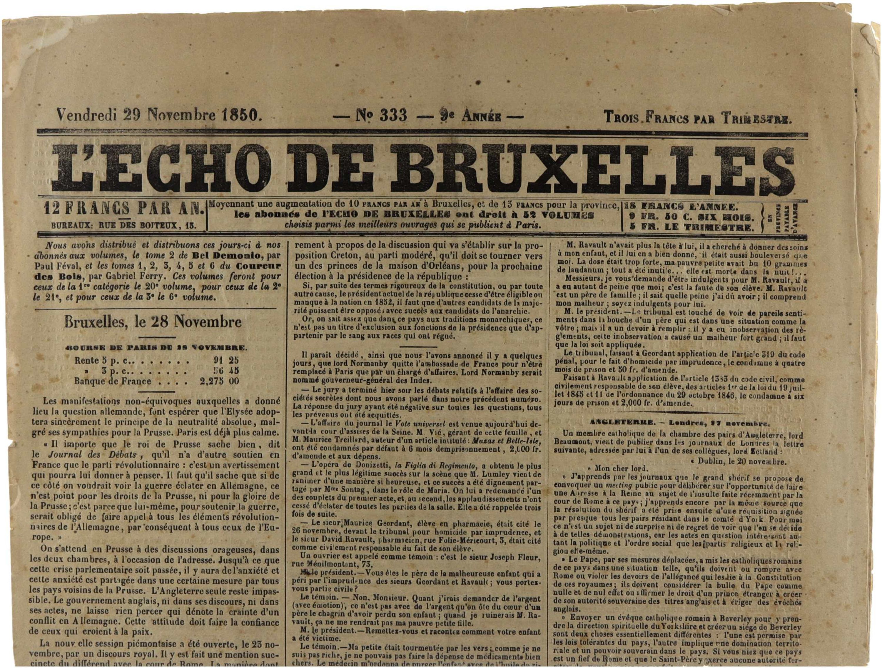 L'echo de Bruxelles, vendredi 29 novembre 1850 (Journal politique et d’annonces)