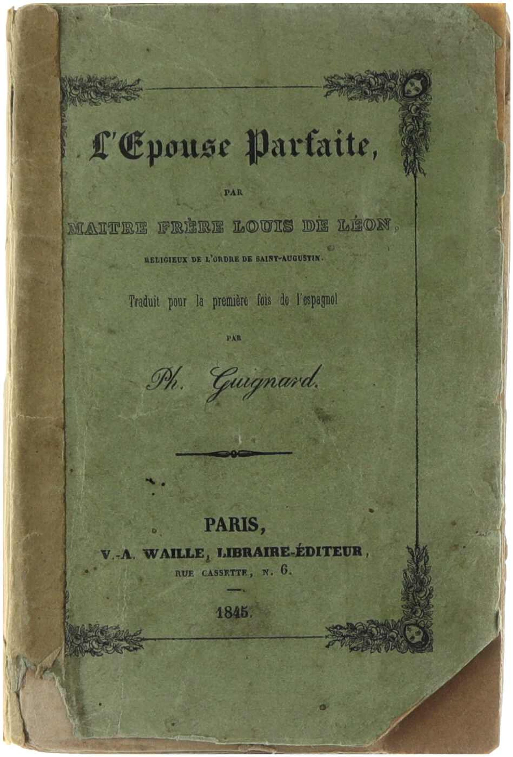 L’épouse parfaite est un traité moral et spirituel de Louis de Léon, présenté ici dans une traduction française par Ph. Guignol. L’ouvrage propose un idéal chrétien de l’épouse, fondé sur les vertus de piété, d’obéissance, de modestie et de dévouement au foyer. À travers réflexions et exhortations, le texte entend guider les femmes mariées dans leur conduite religieuse et domestique, en inscrivant le mariage dans une perspective de perfection morale et spirituelle. Cette édition du milieu du XIXᵉ siècle s’inscrit dans la tradition des ouvrages de morale chrétienne destinés à l’édification familiale