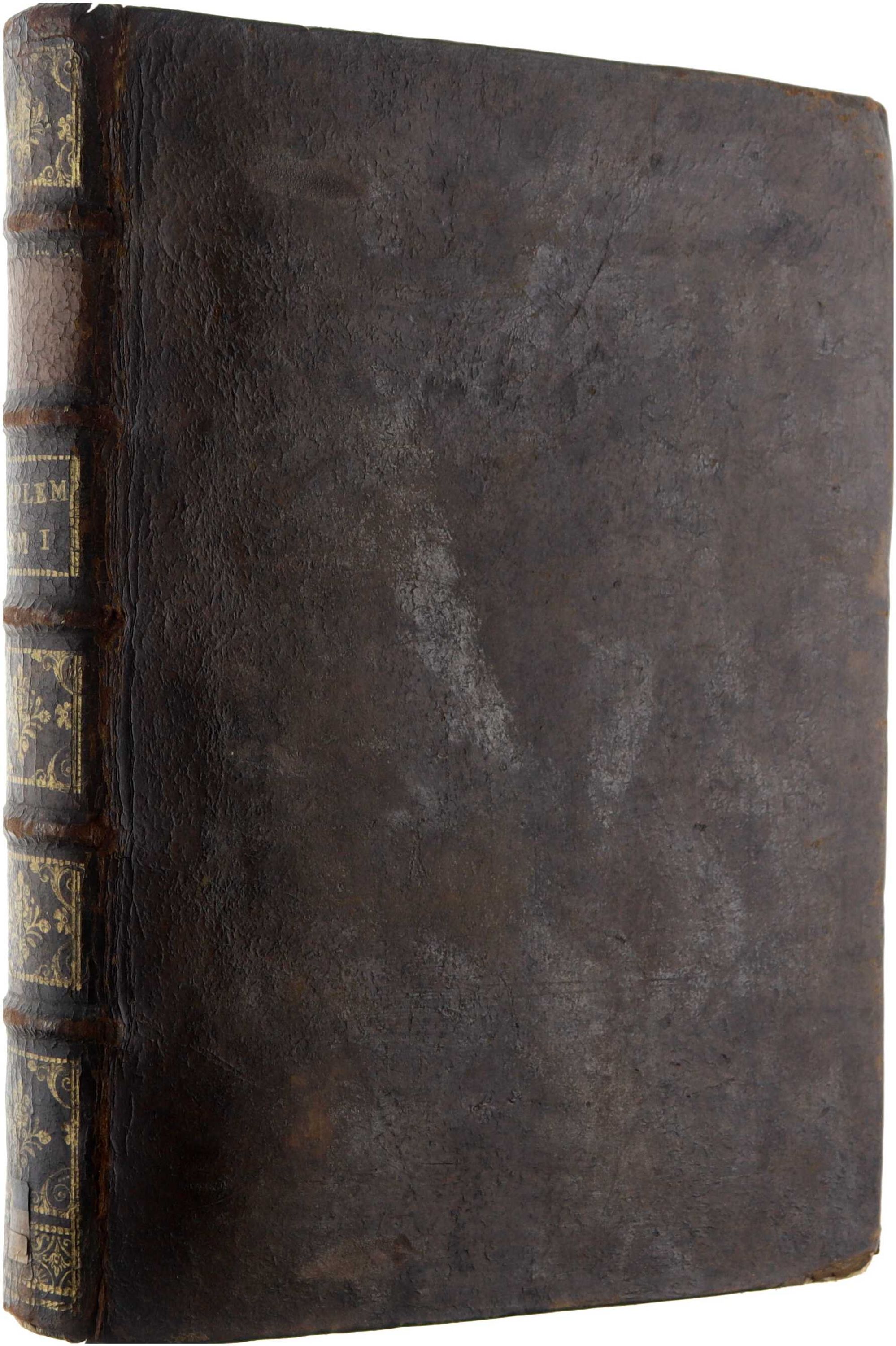 Ex-bib. Tâches de rouille. Sali, coiffes arasées, bords et coins émoussés, page de titre partiellement manquante, quelques pages du préface du libraire sont arrachées (manquent).