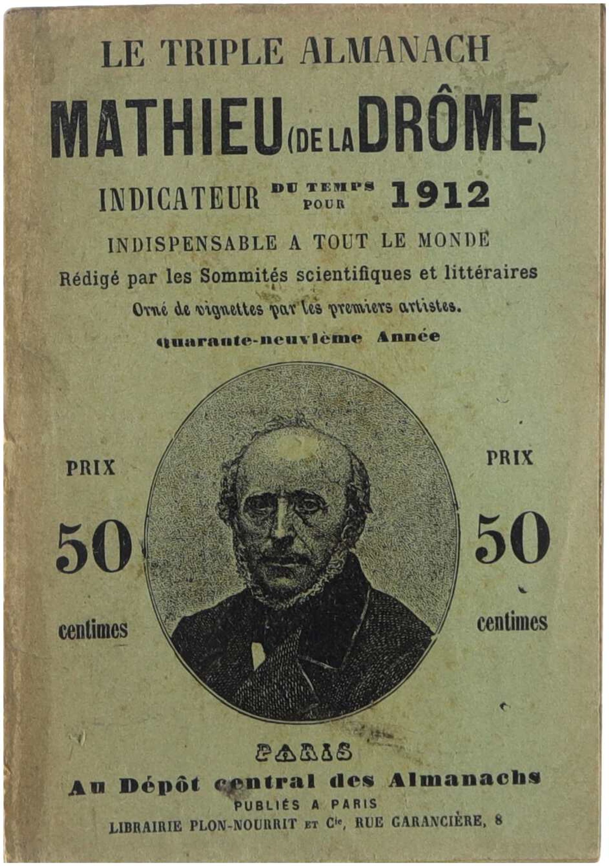Le Triple Almanach Mathieu de la Drôme : Indicateur du temps est un almanach populaire français publié au XIXᵉ et au début du XXᵉ siècle, destiné à un large public rural et domestique. Comme beaucoup d’almanachs de cette époque, il combine un calendrier annuel détaillé avec des indications météorologiques censées annoncer le temps des mois à venir, des phases de la lune, ainsi que divers renseignements utiles pour la vie quotidienne. L’ouvrage s’inscrit dans une tradition éditoriale très répandue où les prévisions météorologiques, souvent inspirées d’observations empiriques et de croyances astrologiques, côtoient des conseils pratiques liés notamment à l’agriculture, au jardinage et à l’organisation de l’année. On y trouve également des textes courts, anecdotes, notices instructives ou morales et parfois des informations d’intérêt général, ce qui en faisait à la fois un guide pratique et un petit livre de lecture familiale. Dans son contexte historique, ce type d’almanach jouait un rôle important dans la diffusion d’informations simples auprès d’un public qui ne disposait pas toujours d’autres sources régulières d’actualités ou de conseils pratiques.