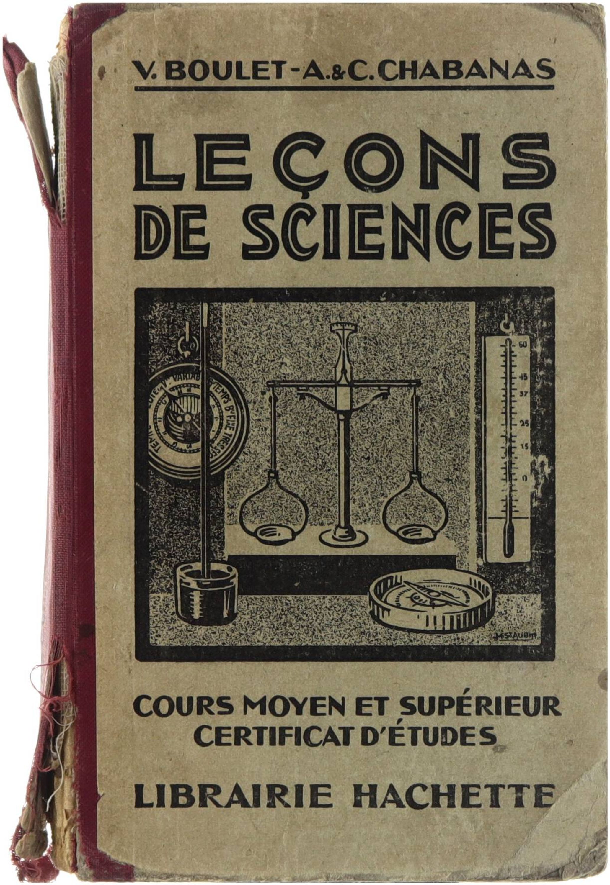 Leçons de Sciences. Cours moyen et supérieur. Certificat d’études, rédigé par V. Boulet et A. & C. Chabanas et publié à Paris par Hachette, est un manuel destiné aux élèves du cours moyen et du cours supérieur préparant le Certificat d’études primaires dans la France de la première moitié du XXᵉ siècle. L’ouvrage s’inscrit dans la tradition de l’école républicaine, où l’enseignement scientifique vise à transmettre des connaissances pratiques et structurées adaptées à la vie quotidienne et à la formation civique. Il propose des leçons organisées de manière progressive, couvrant les bases de la physique, de la chimie, des sciences naturelles et de l’hygiène, avec une approche descriptive et pédagogique caractéristique des manuels de l’époque. Les contenus mettent l’accent sur l’observation, l’explication des phénomènes naturels et l’utilité concrète des savoirs scientifiques, reflétant à la fois les programmes officiels et l’idéal d’instruction populaire porté par l’école primaire française.