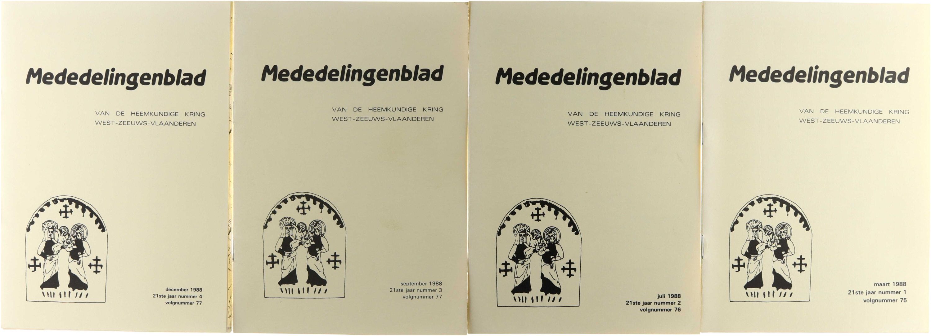 Jaargang 21 (1988). Volgnummer 75 (maart 1988): -Jaarvergadering [agenda, na de pauze volgt een lezing van W. Vanderpijpen over het Vlaamse platteland rond 1800, toelichting bij de agenda] p. 1 -Verbroederen, [samenwerking met de heemkundige kring St.-Guthago wordt geïntensiveerd] A.[C.] d[e] K[euninck] p. 2 -Openbaar vervoer in streekmuseum [tentoonstelling te IJzendijke] p. 2 -Mededelingenblad [de naam blijft gehandhaafd] p. 3 -Bijdrage nummer 16 [in voorbereiding] p. 3 -Graftombe van kolonel Ledel, [vernieuwd] [G.A.C.] v[an] V[ooren] p. 3 -Leeuwekop Nieuwvliet werd in ere hersteld, A.C. de Keuninck p. 4 -In memoriam Willem J. Visser, A. Luteyn p. 5 -Bunkers te Oostburg [brief van het bestuur van onze vereniging aan de gemeenteraad van Oostburg waarin opgenomen een aantal argumenten om het bunkercomplex niet te slopen] p. 7 -Boerderijen stichting Zeeland [vraagt vrijwilligers voor het inventariseren van boerderijen] p. 9 -Vijfentwintig jaar heemkundige kring (1), G.A.C. van Vooren p. 9 -De vleesvoorziening te Zuidzande in de Tweede Wereldoorlog, G. van de Velde p. 13 -Stamboom familie Luteyn, [in voorbereiding] A. Luteyn p. 18 -Mei in Zeeland, [gedicht] W. Notebaart p. 19 -Hoeve Steenoven, J. Risseeuw p. 19. Volgnummer 76 (juli 1988): Excursie naar Bergen op Zoom p. 1 -Jaarverslag 1987, G.A.C. van Vooren p. 2 -Financieel verslag over 1987, J.S.M. van Bellegem p. 4 -Verslag, [van de algemene vergadering van 23 april 1988] G.A.C. van Vooren p. 5 -In en om de oude Zeeuws-Vlaamse landbouwschuur [verslag van de lezing door J. Risseeuw] p. 7 -Vijfentwintig jaar heemkundige kring (2), G.A.C. van Vooren p. 8 -Zomeravond in Zeeuwsch-Vlaanderen, [gedicht] W. Notebaart p. 13 -Dr. J. de Hullu, geschiedvorser en historicus, G.A.C. van Vooren p. 13 -De tram als oostwestverbindng, G.A.C. van Vooren p. 16. Volgnummer 77 (september 1988): -Excursie naar Groede p. 1 -Voordracht over Hugenoten [in Holland en Zeeland door C. Cruson, de organisatie is in handen van het Koninklijk Zeeuwsch Genootschap der Wetenschappen] p. 1 -Activiteiten Sint-Guthago p. 2 -Het Markiezenhof, [verslag van de excursie] J. Risseeuw p. 2 -Aardenburg in de Middeleeuwen [doctoraal scriptie van B.R.de Melker, De ontwikkeling van de stad Aardenburg en haar bestuurlijke instellingen in de middeleeuwen, wordt in de scriptiereeks van de Commissie Regionale Geschiedbeoefening Zeeland uitgegeven] p. 4 -Vijfentwintig jaar heemkundige kring (3), G.A.C. van Vooren p. 4 -De doopsgezinden te Aardenburg in de 17de eeuw, [G.A.C. van Vooren] p. 9 -De doopsgezinden in Den Biezen, [G.A.C. van Vooren] p. 13. Volgnummer 77 [sic] (december 1988): -Lezing I [door H. Sakkers over de Duitse bunkers in ons gewest] p. 1; -Lezing II [door A. Luteyn getiteld: Komplot tegen koning Leopold III koning van België] p. 1; -Lezing III [over de landschappen van Zeeuws-Vlaanderen door J. Gremmen] p. 2 -Jaarvergadering [bekendmaking datum en lezing na de pauze] p. 2 -Zeeland in de Tweede Wereldoorlog [bibliografie van de Zeeuwse oorlogsgeschiedenis onder de titel: Zeeland 1940-1945 uitgegeven door het Zeeuws Documentatiecentrum] p. 2 -Financiële zaken [de automatisering van het ledenbestand en de contributie-inning zijn nagenoeg voltooid] p. 3 -Bezoek aan Groede, [verslag excursie] A.C. de Keuninck p. 3 -De landbouw in West-Zeeuws-Vlaanderen van 1914 tot 1940, E.E.C. van den Hemel p. 4 -Zeeuwse historie in kranteknipsels, [er verschijnt een catalogus van de Zeeuws-Vlaamse onderwerpen in deze verzameling] J.P. Luteijn p. 7 -Vijfentwintig jaar heemkundige kring (4), G.A.C. van Vooren p. 9